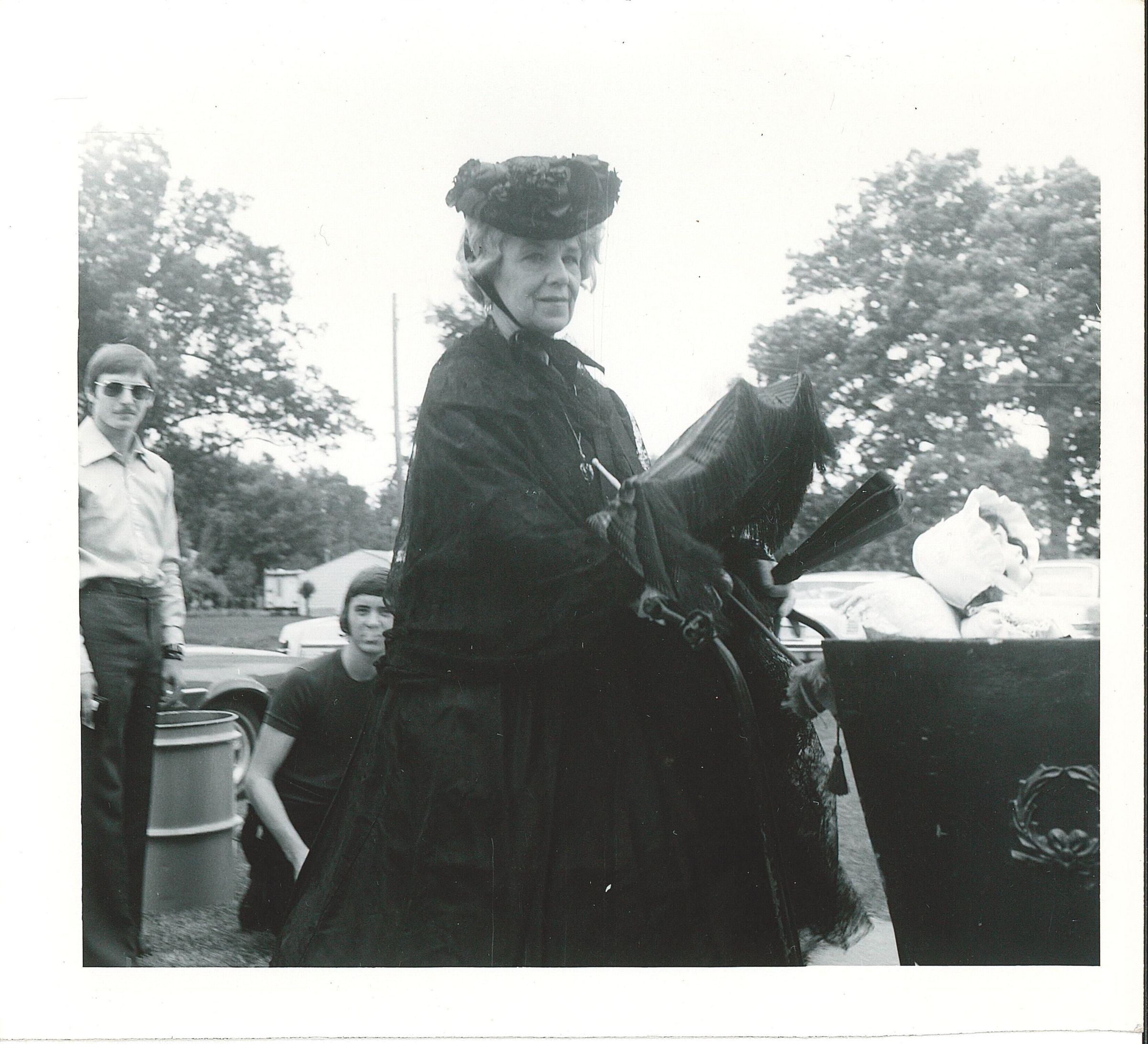 Unknown person dressed in historical costume and pushing a baby carriage. Part of the 1975 or 1976 Bicentennial celebration.Collection