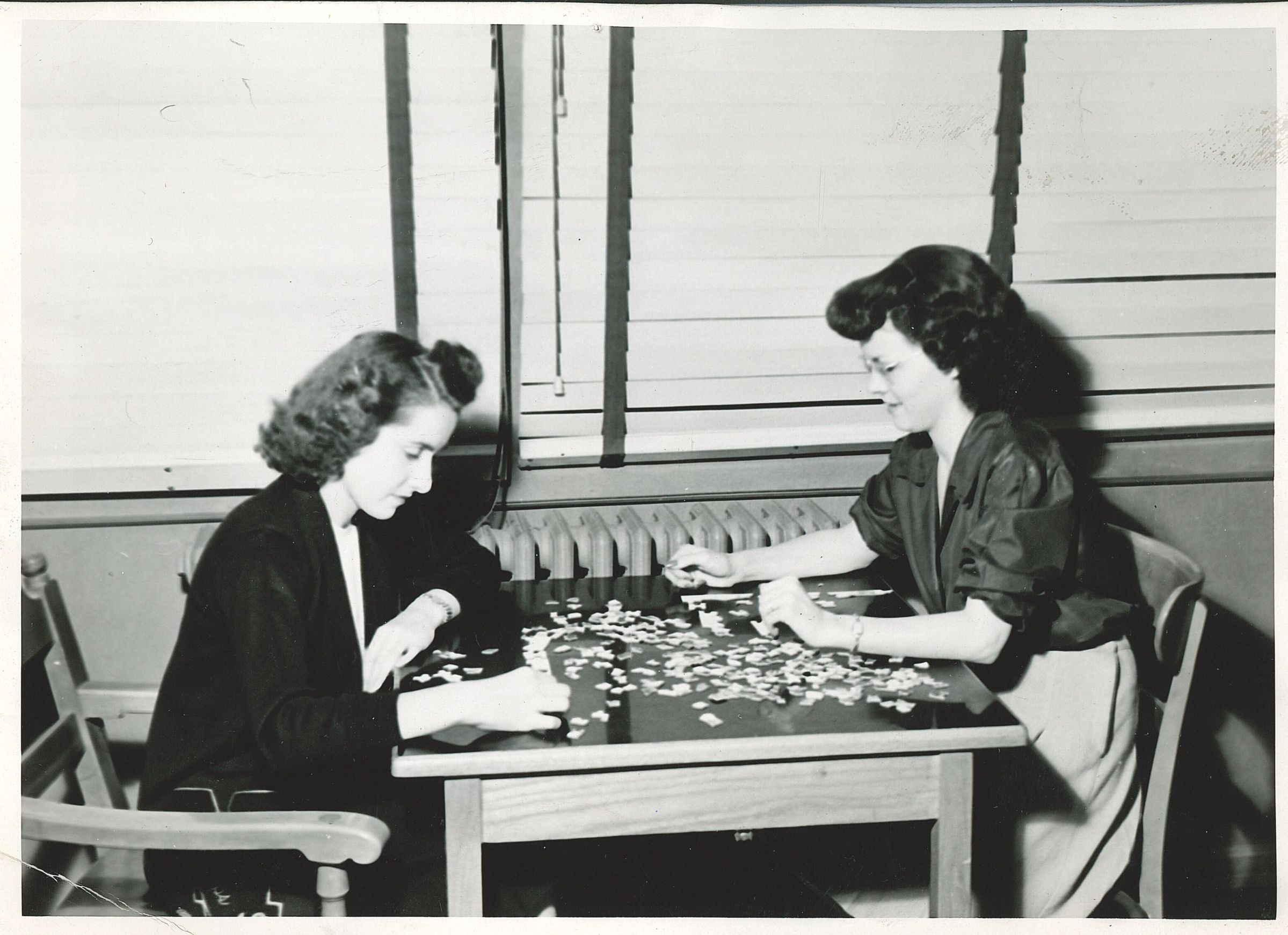 Miss Doris Morrison and Miss Doris Boyd of Newton Falls, OH, doing a puzzle at the USO Club.Photograph Details