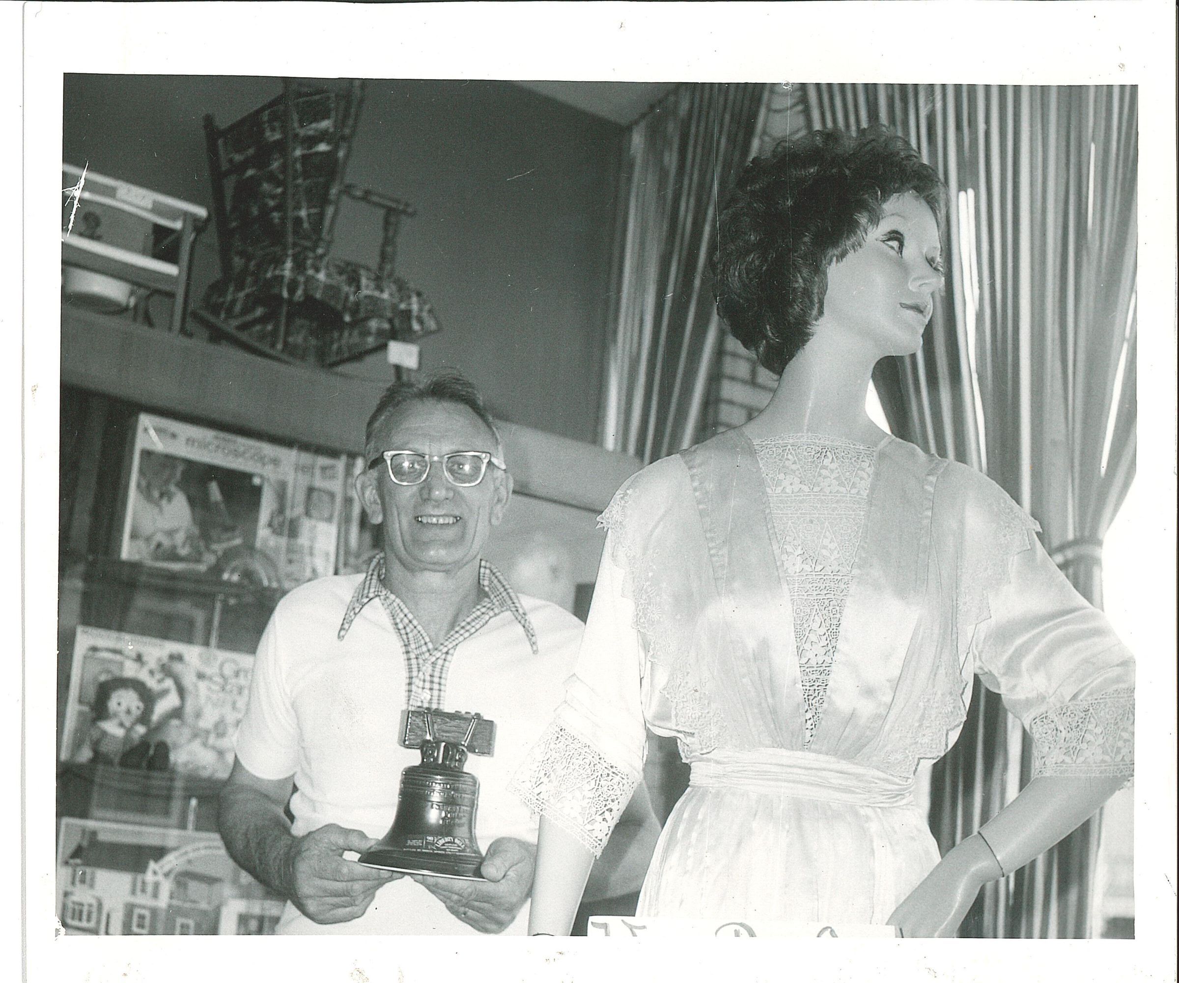 Joseph Layshock decorated his Broad Street business window for the 1975 Bicentennial Celebration. The mannequin is wearing his mother's 1913 wedding dress.Photograph Details