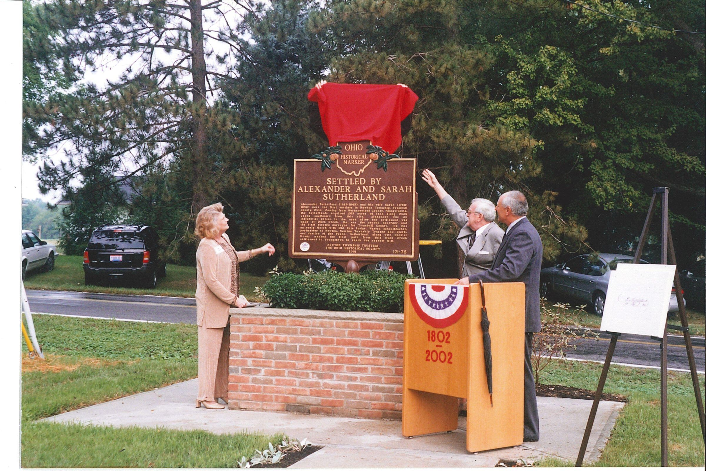 Newton Township celebrated its bicentennial by erecting a plaque at the intersection of Hallock-Young and Hallock-Sook Road in honor of its first settlers, Alexander and Sarah Sutherland. Township trustee Peter J. Augusta unveils the historical marker as other township officials look on. L-R: Kay Lingo, township clerk; George Prelac, township trustee; and Delbert Woloski, township trustee and chairman.Photograph Details