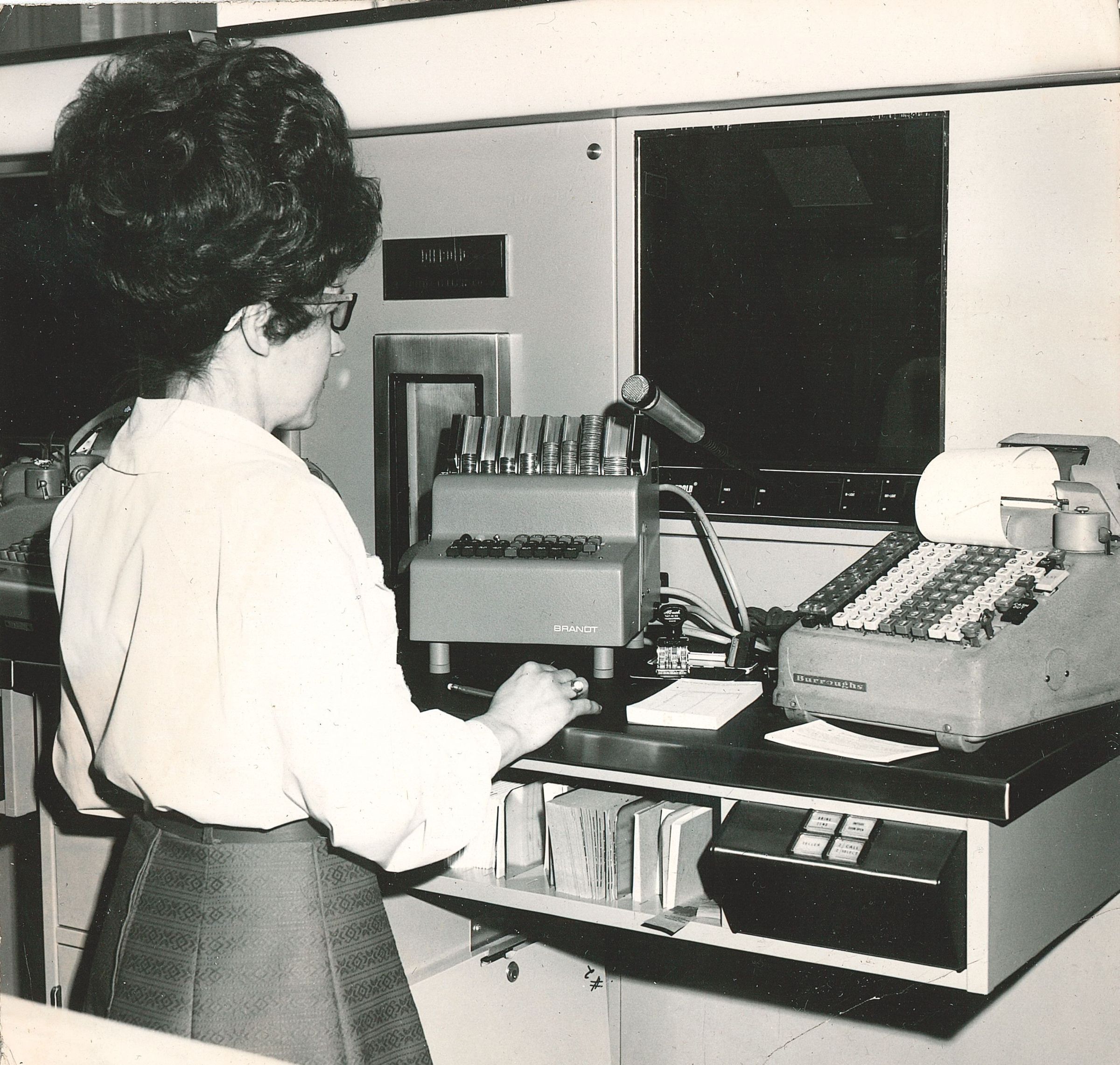 The Union Savings & Trust Co. provide a TV Teller for the customers convenience. Mrs. Viola Dunlap is shown handling banking needs.Photograph Details