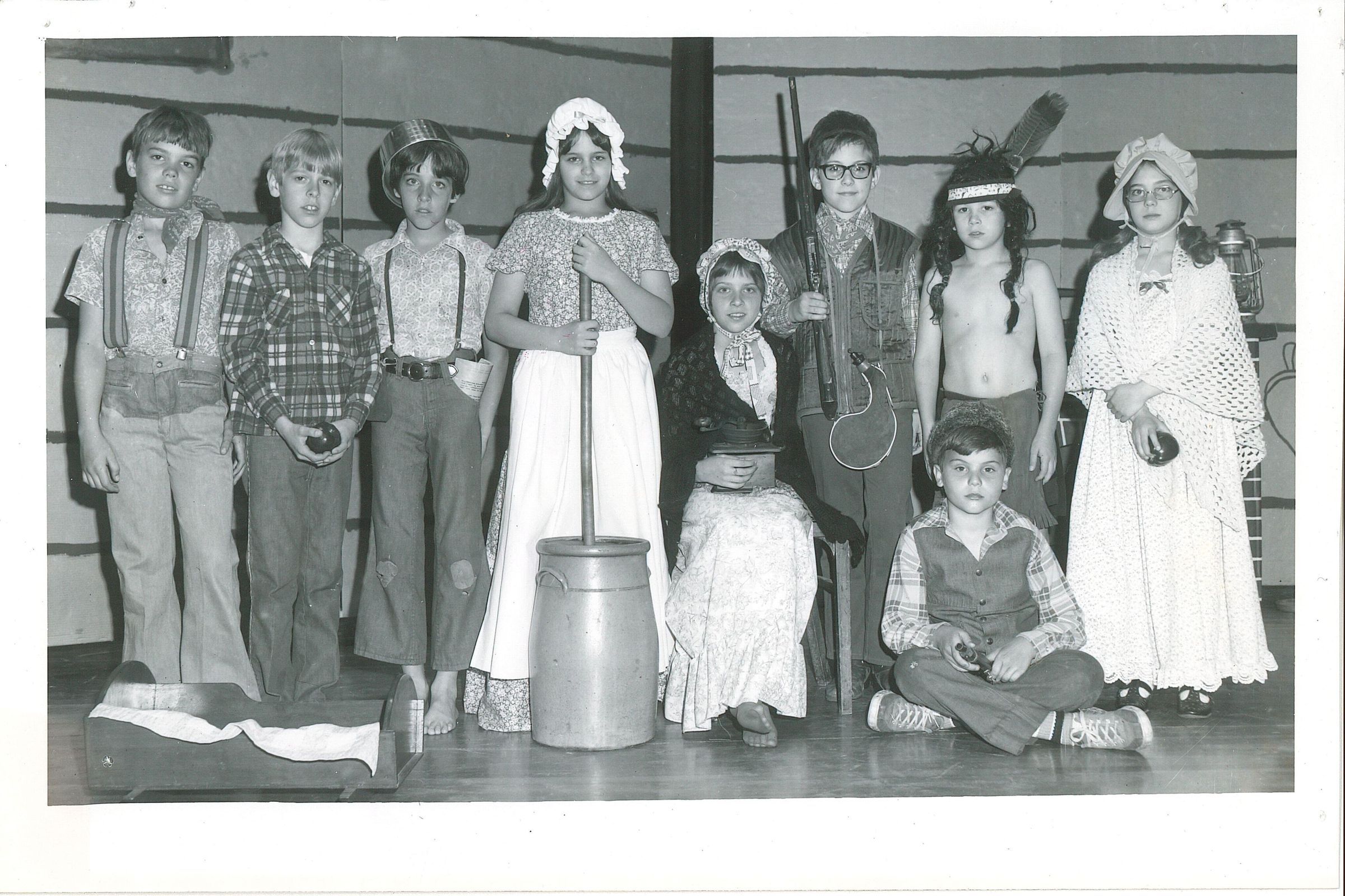 "Pioneer Day" for the fourth graders at Newton Falls Middle School. Standing, L-R: Brian Platt, Richard Johnson, Mike Novotny, Diane Hood, Brian Nussle, Wally Wortman, and Tonya Shaulis. Seated, L-R: Lori Morrison and Clyde Higgins.Photograph Details
