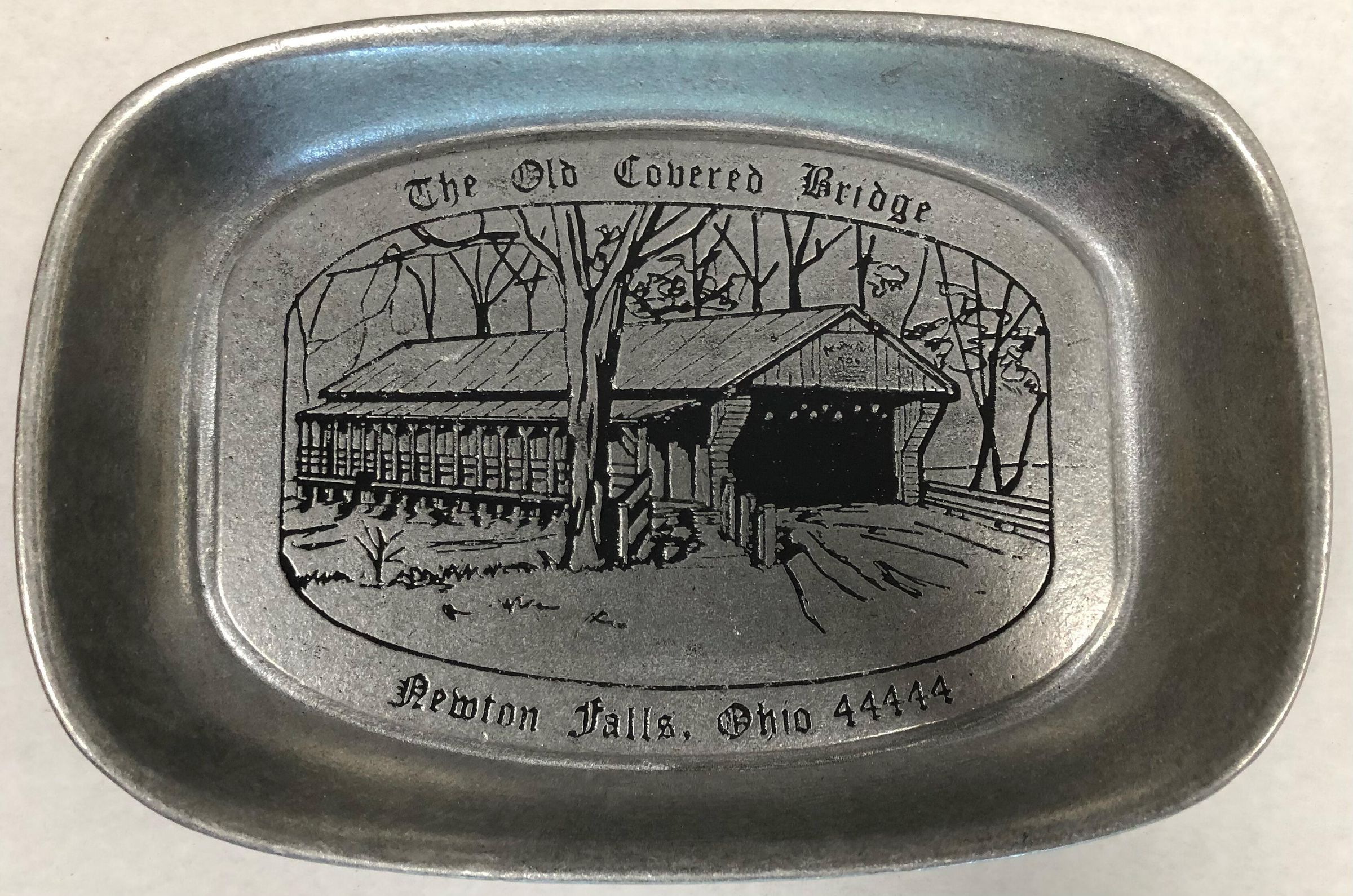 Souvenir pewter tray with "The Old Covered Bridge Newton Falls, Ohio 44444" and an image of the bridge engraved inside.Acquisition