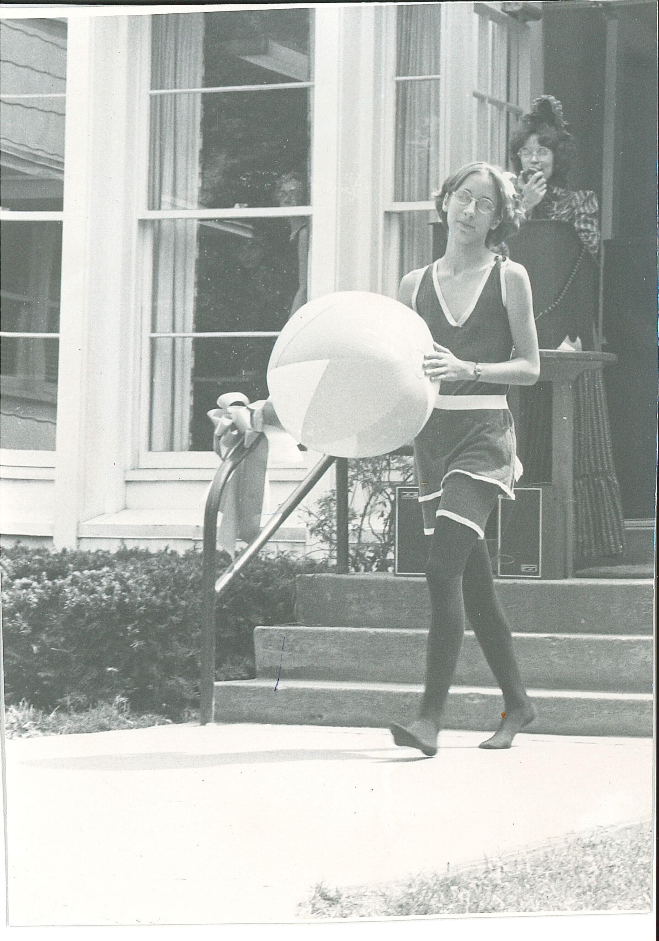 Unknown person modeling a 1910s/1920s style swimsuit for the Nostalgic Fashion Style Show held at the Community Center. Part of the 1975 or 1976 Bicentennial celebration.Category