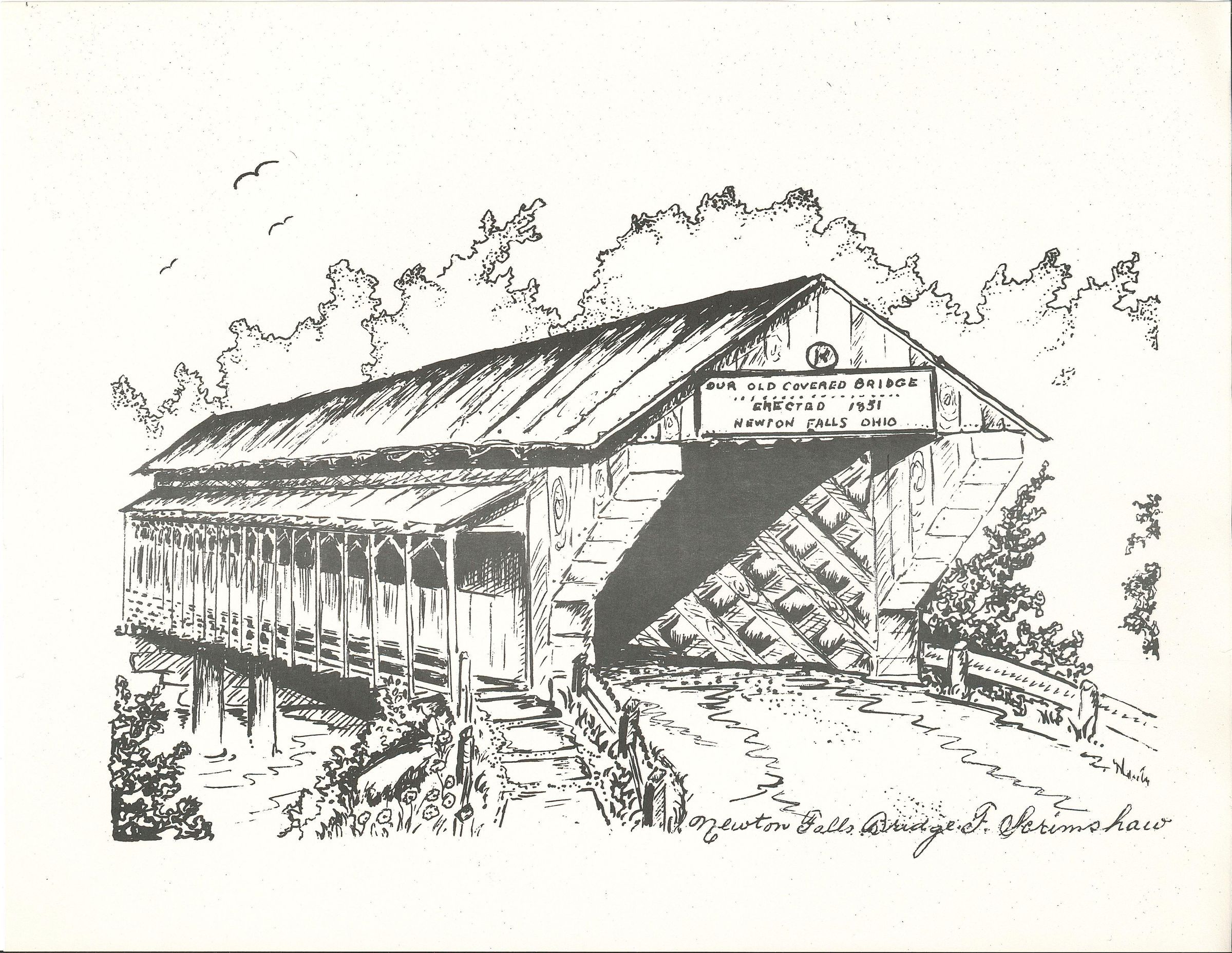 Drawing of the wooden covered bridge over the east branch of the Mahoning River. Artist unknown.