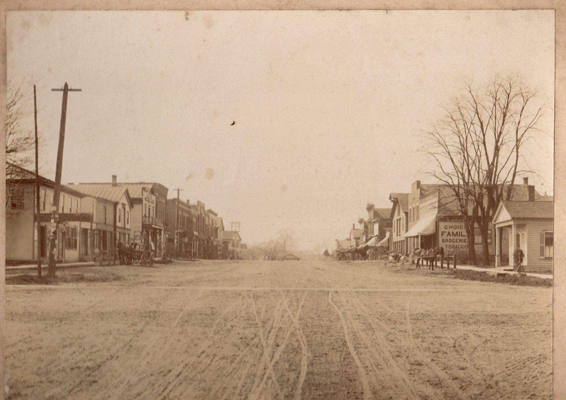 Center and Broad Street looking west towards the double covered bridge. North side of street is Rice's Drugstore, next to Klingensmith Bakery. Down further is Dean Brothers who were tailors.Photograph Details