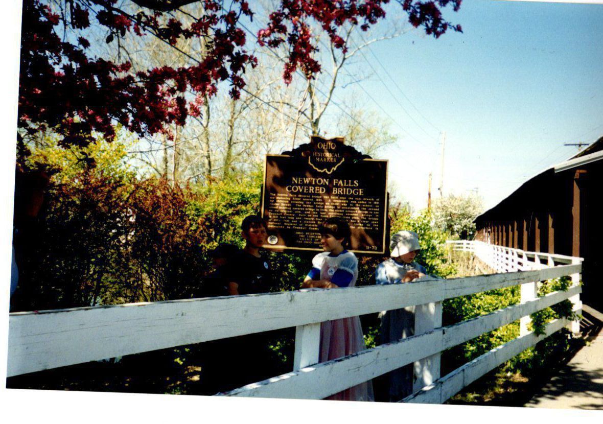 Shown are third graders from Middle School that participated in the program. Behind them is the Historical Marker for the Covered Bridge.Photograph Details