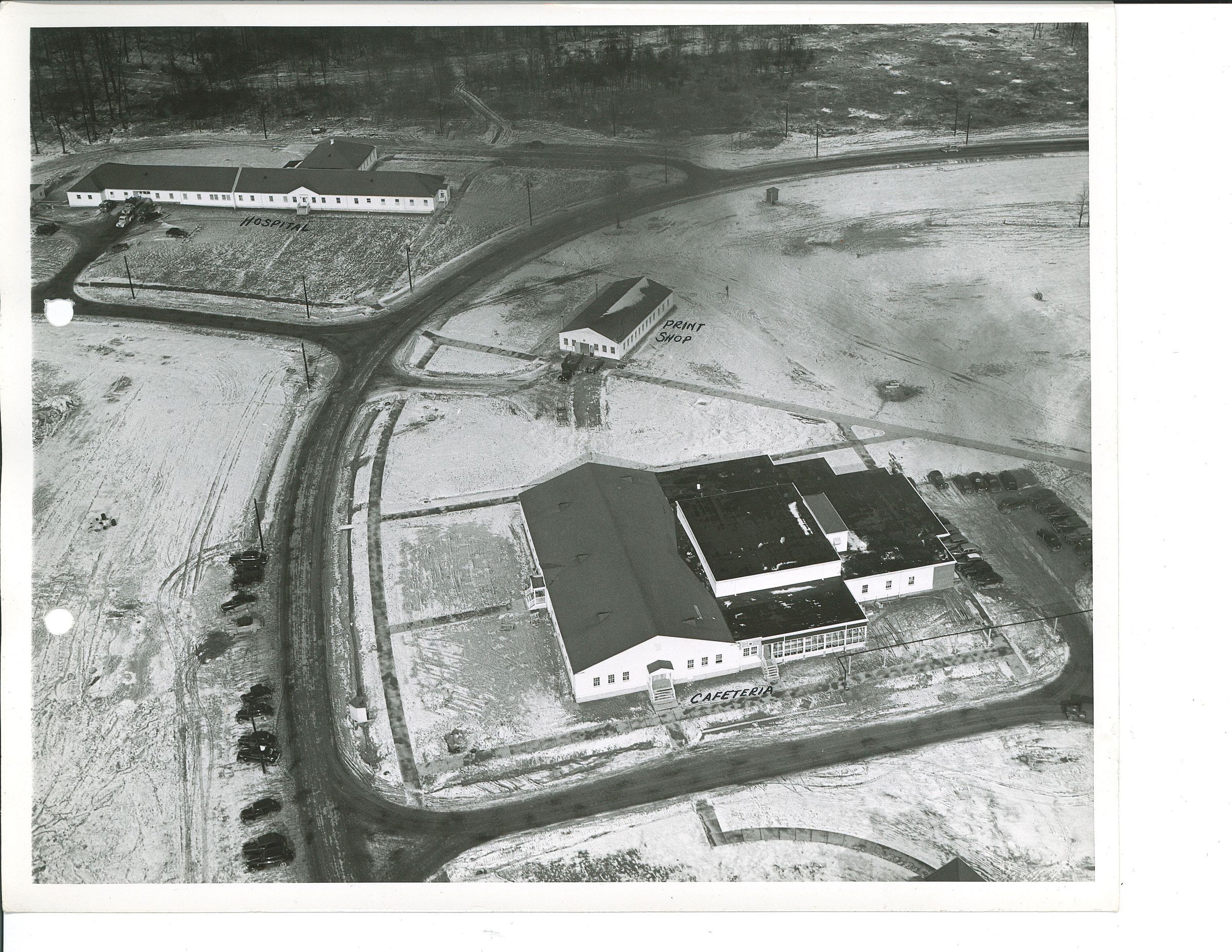 Ariel view looking northwest of the administration area showing the comleted superstructures of the Hospital, Paint Shop and Cafeteria and the improved roads and walks in this area. From Class "A" Construction Photographs - Hunkin-Conkey Construction Company, Book NO. 4Photograph Details