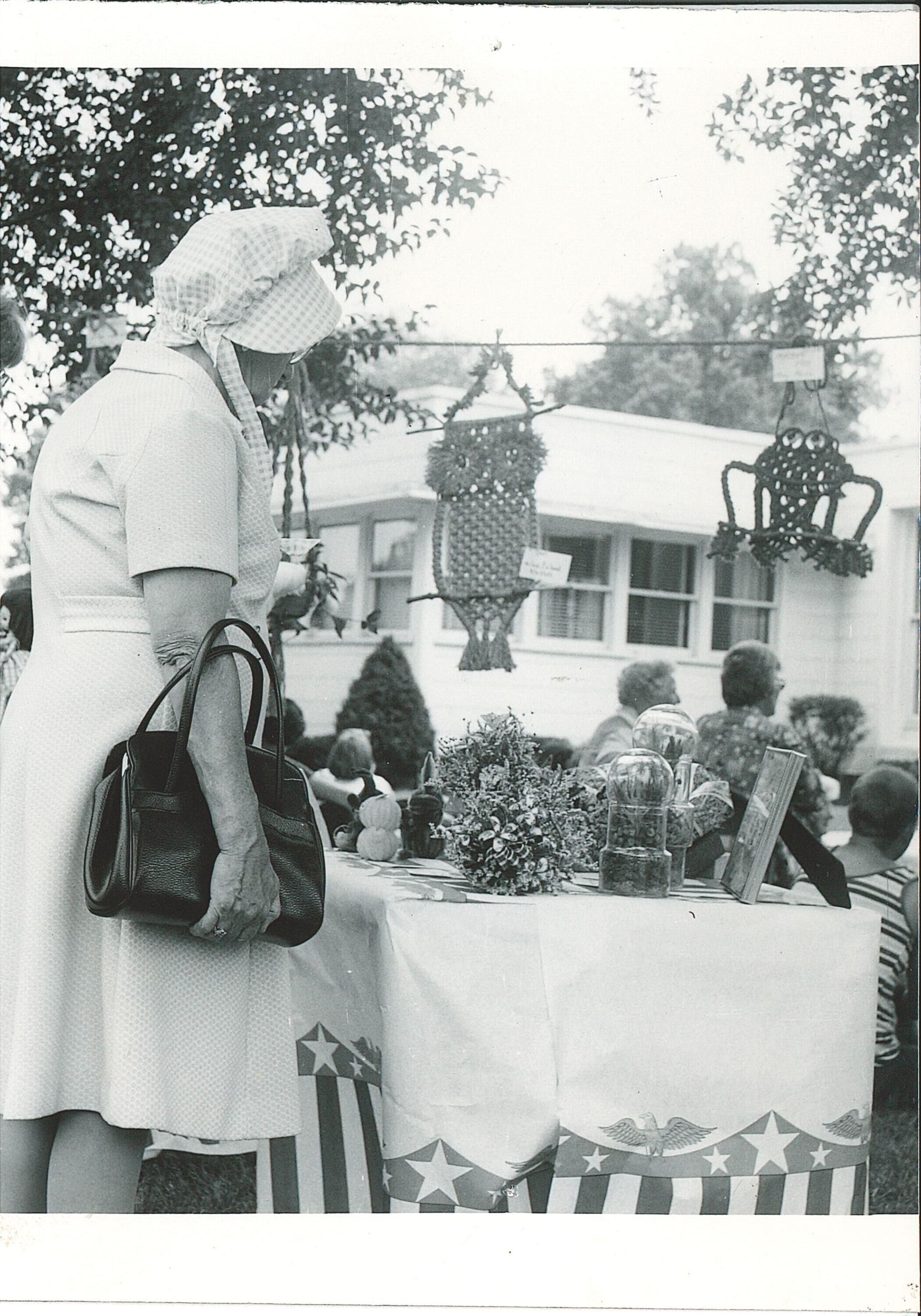 Unknown person looking at macramé and other art at the Community Center art show. Part of the 1976 Bicentennial celebration.Collection