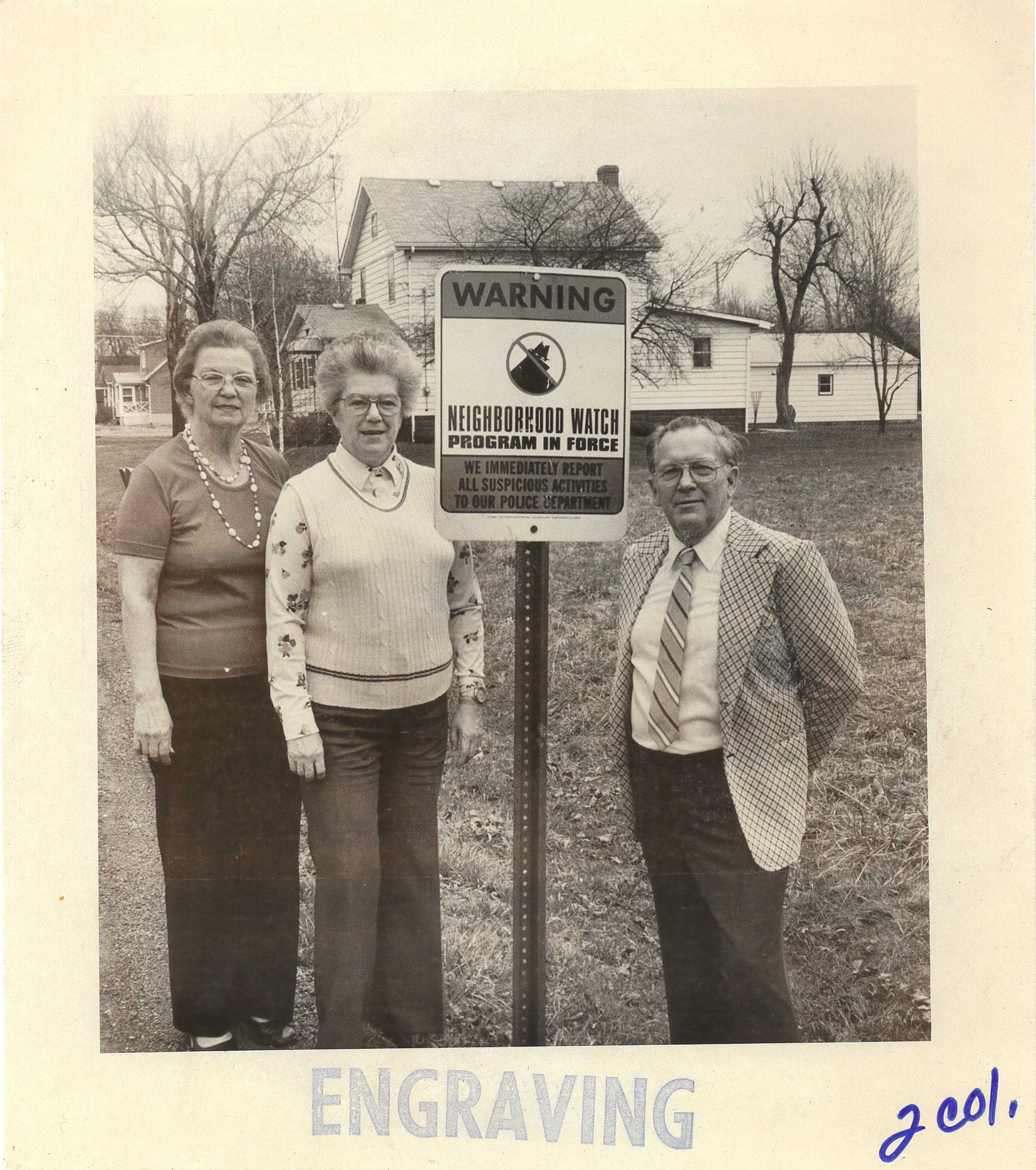 Newton Falls officers of the Neighborhood Watch Program along side one of the watch on Ticknor Ave. Left to Right: Naomi Gates, Barbara Chipman and Gilbert Chipman.Photograph Details