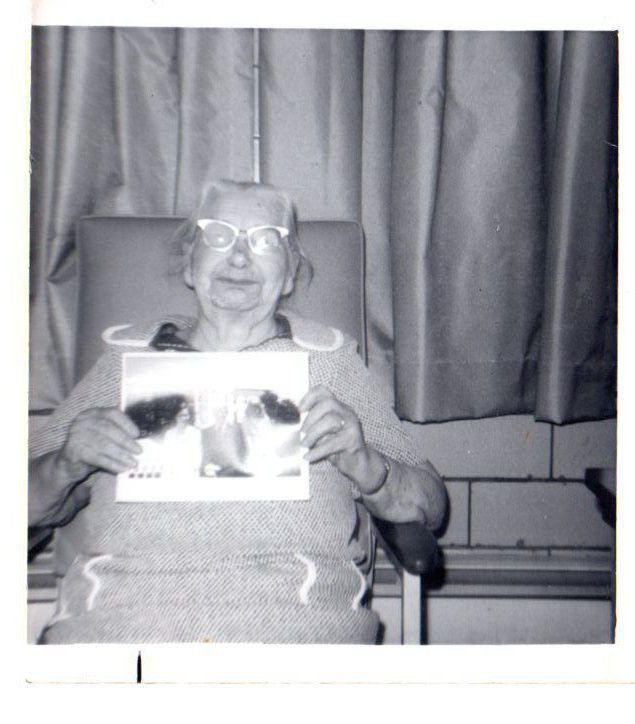 Edgewater Nursing Home resident, Anna Spiny holds the photo of President Carter and family sent to the residents for their placemats the residents made and sent to them.Photograph Details