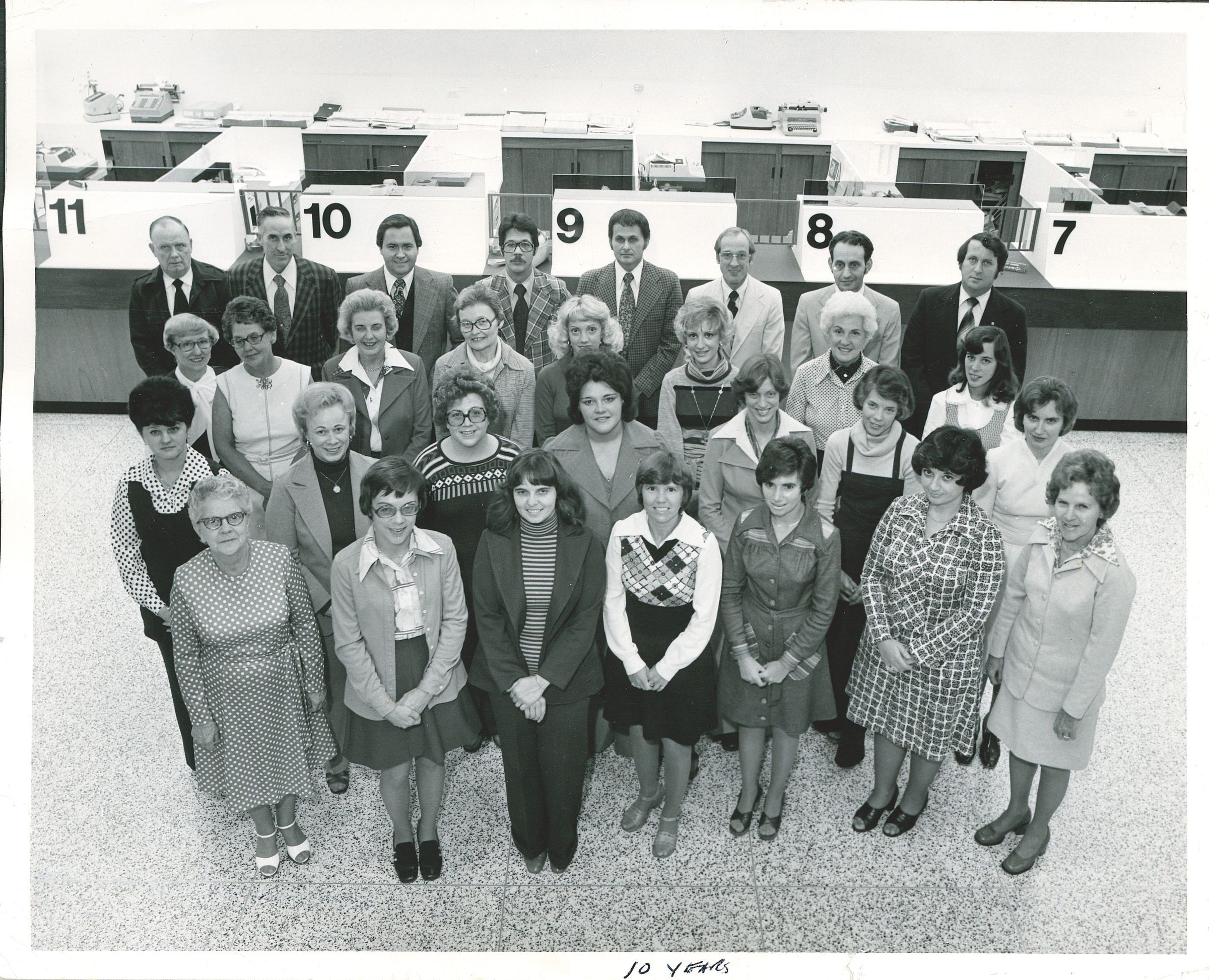 The Second National Bank members that have given 10 years of service. Left to Right: Row 1: Audrey Lewis, Kathy Brady, Linda Hrenko, Janice Boucher, Kathy Stanco, Lucy Perfatte and Emily Barber. Row 2: Patty King, Clara Bangert, Ruth Gosser, Claudette Dawson, Carlene Wolff, Karen Krisher and Karen Kline. Row 3: Julie Clark, Maida Hardy, Betty Motok, Flo Devorich, Darla Neugebauer, Diane Manofsky, Eleanor Fredrick and Darla Canfield. Row 4: Phil Kimla, Charles Blevins, Dave Howells, Jim Probst, Dick Walters, Sam Bixler, Lou Furano and Jim Donaldson.Photograph Details