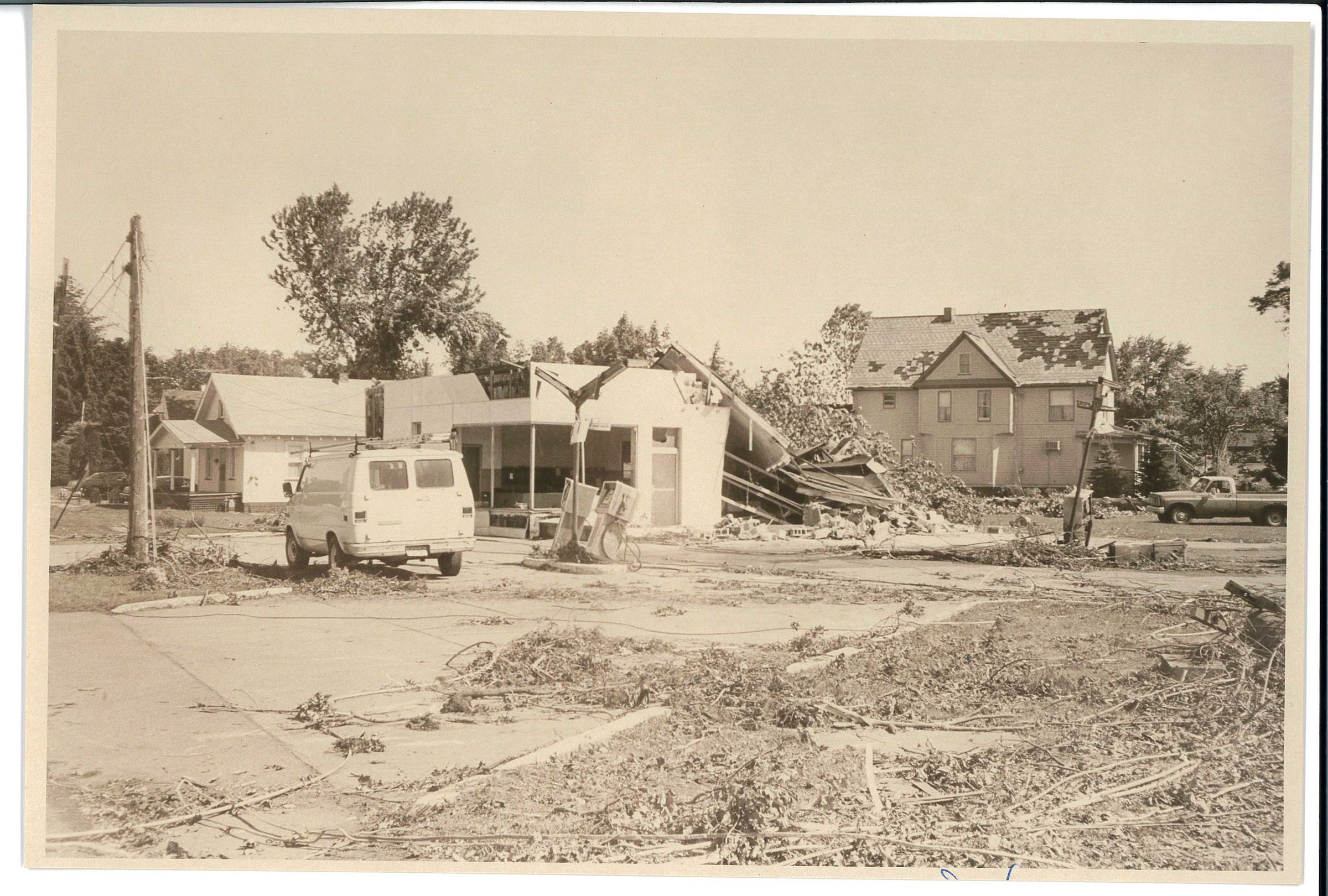 Damage to the Phillips Asland Station at the intersection of Ridge Road and Broad Street. It was the fisrt business in Newton Falls to be hit by the tornado. Frankie phillips is the ower since his retirement after 28 years at Republic Steel. The business has been there since 1953. Borowski Funneral Home in background.Photograph Details