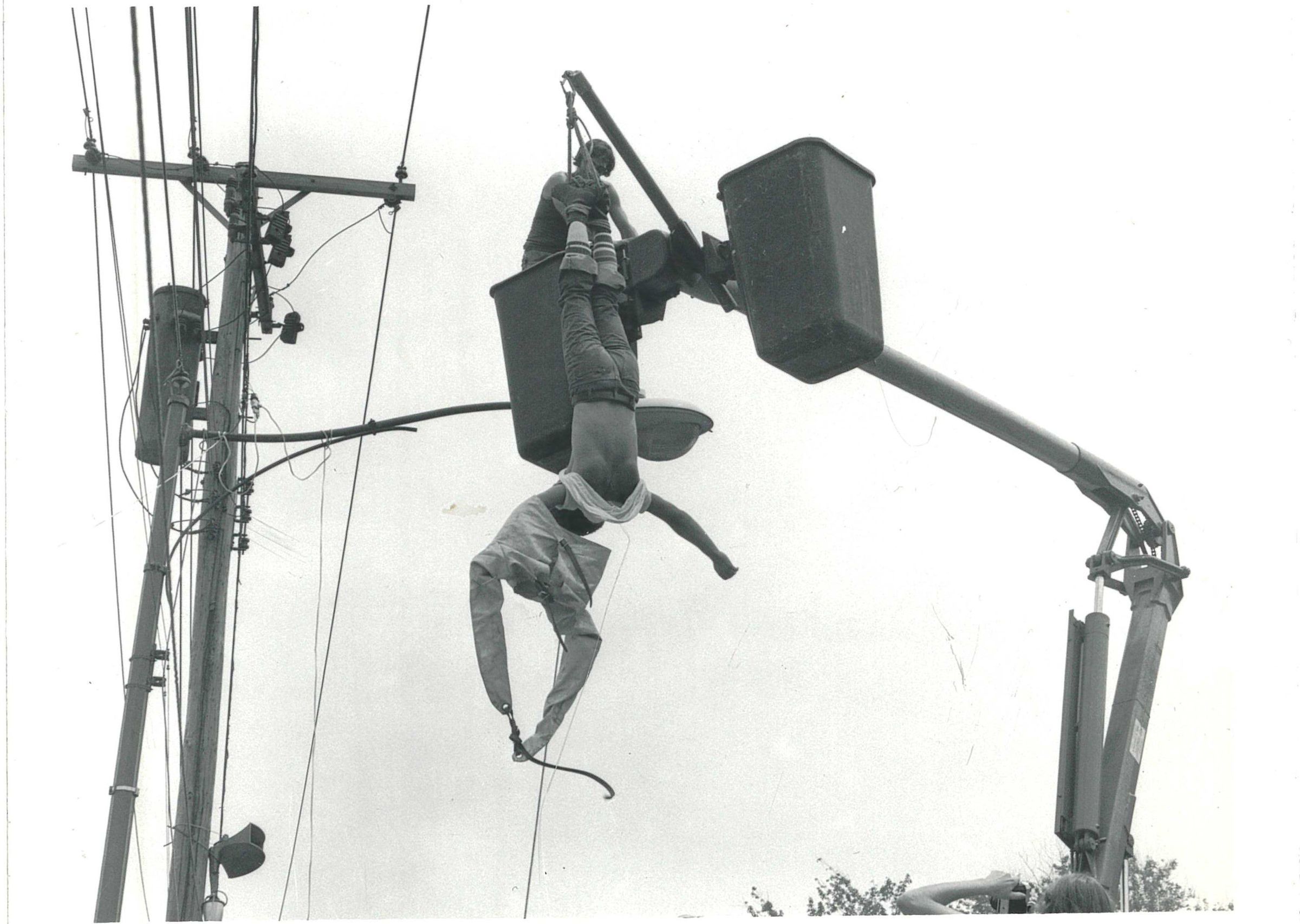 Escape artist Steve Simpson escaping from a straight jacket while hanging upside down from a crane.Photograph Details