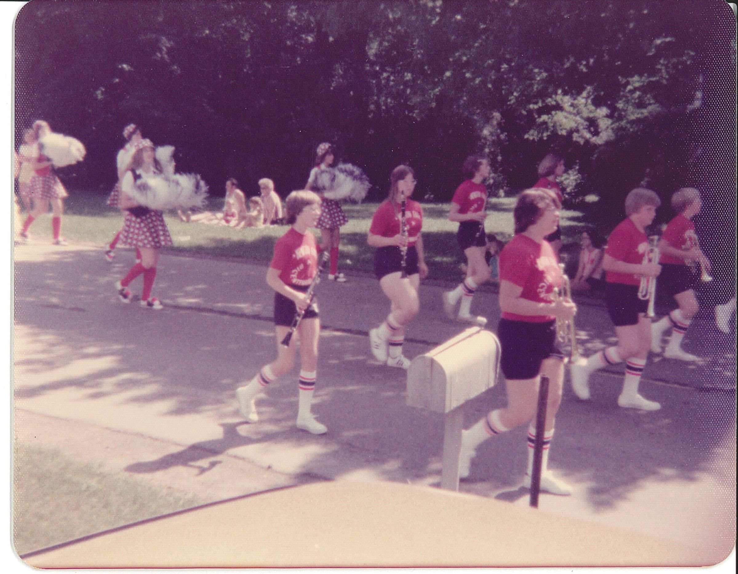 Band members and cheerleaders marching in the 1976 Fourth of July Bicentennial ParadePhotograph Details
