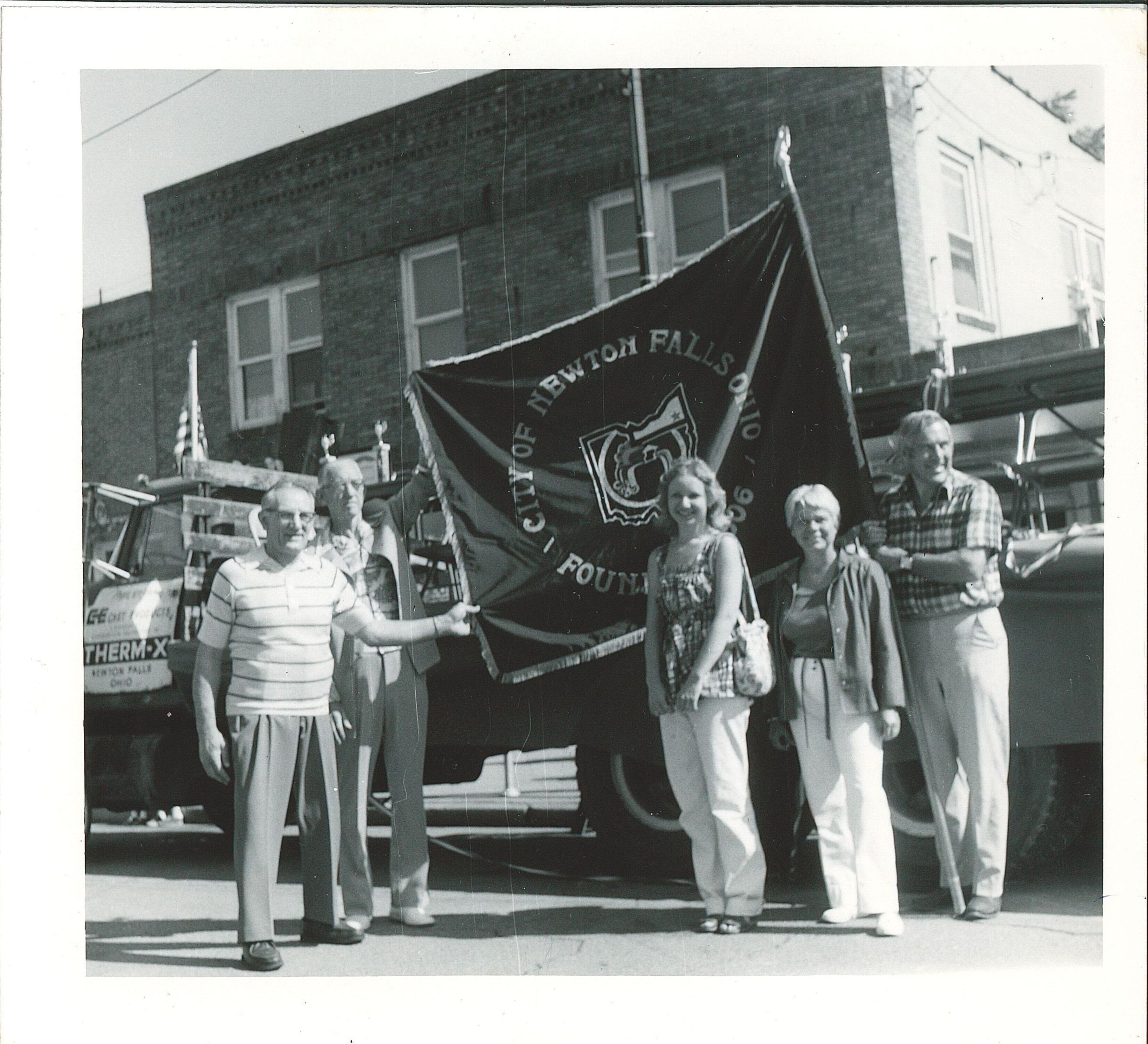Mayor Joseph Layshock, Bicentennial Chairman Byron Wassink, Barbara Dedon, Doris Phieffer, and unidentified man displaying the City of Newton Falls flag at the 1976 Bicentennial celebration.Photograph Details