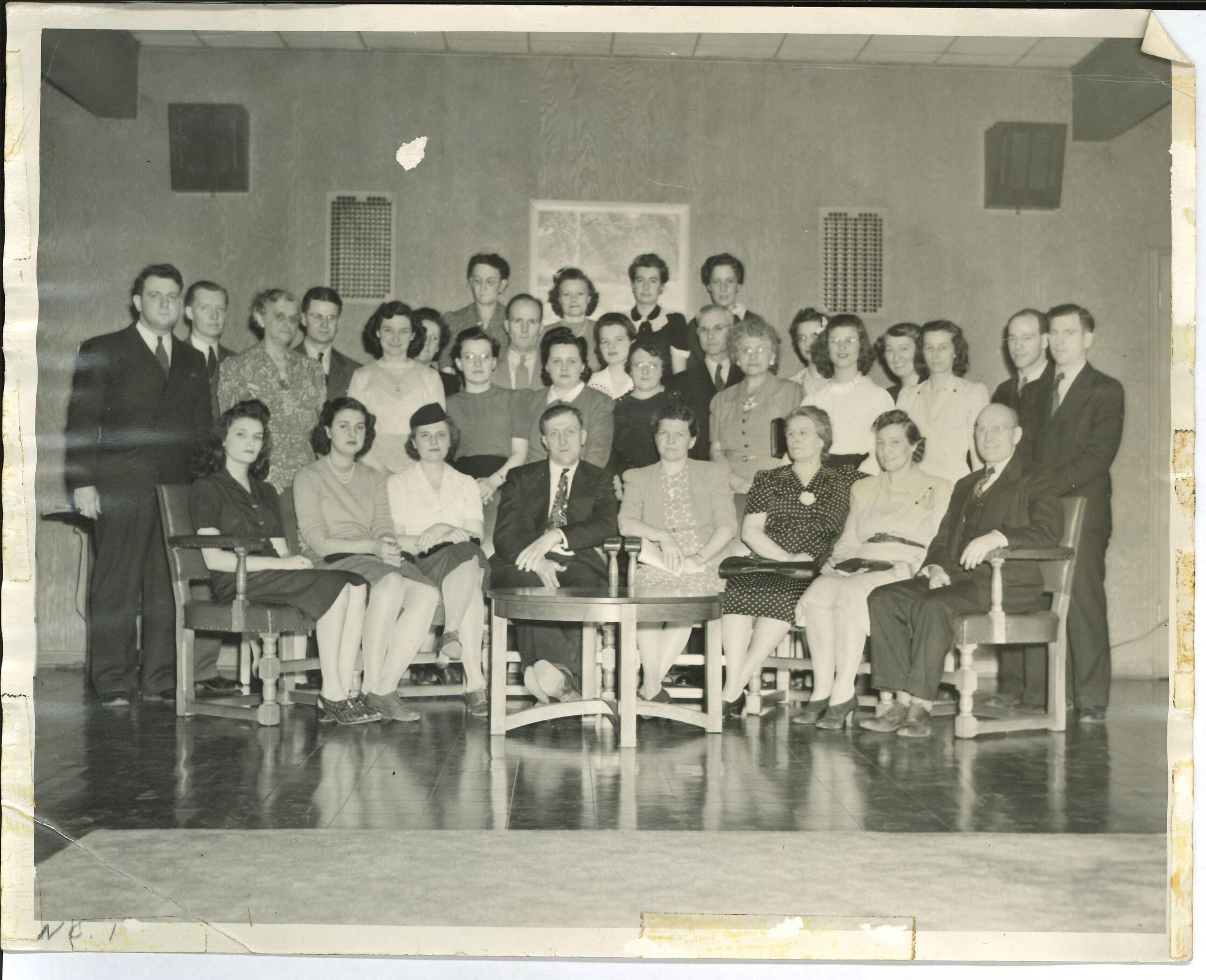 Group picture taken at USO. Walter Hurd, Frank Langley, Mary Harshman, Robert Klotzel, Margie Hough, Florence Held, Ila Smith, Jo Ensign, Jones, Jones, Mrs. Baronne, Gladys Dise, Mrs. Mayfield, Mrs. Stutzer, Stace Harshman, Tommy Harrigan, Mrs. Brisgal, Doris Smith, Helen Wyko, Miss Birks, Dorothy Roach, Harlan Deihr, Mr. Baronne. Seated: 3 arsenal girls, Mr. Stutzer, Irma Hurd, Mrs. Leutz, Mrs. Reagan, Arthur BenderPhotograph Details