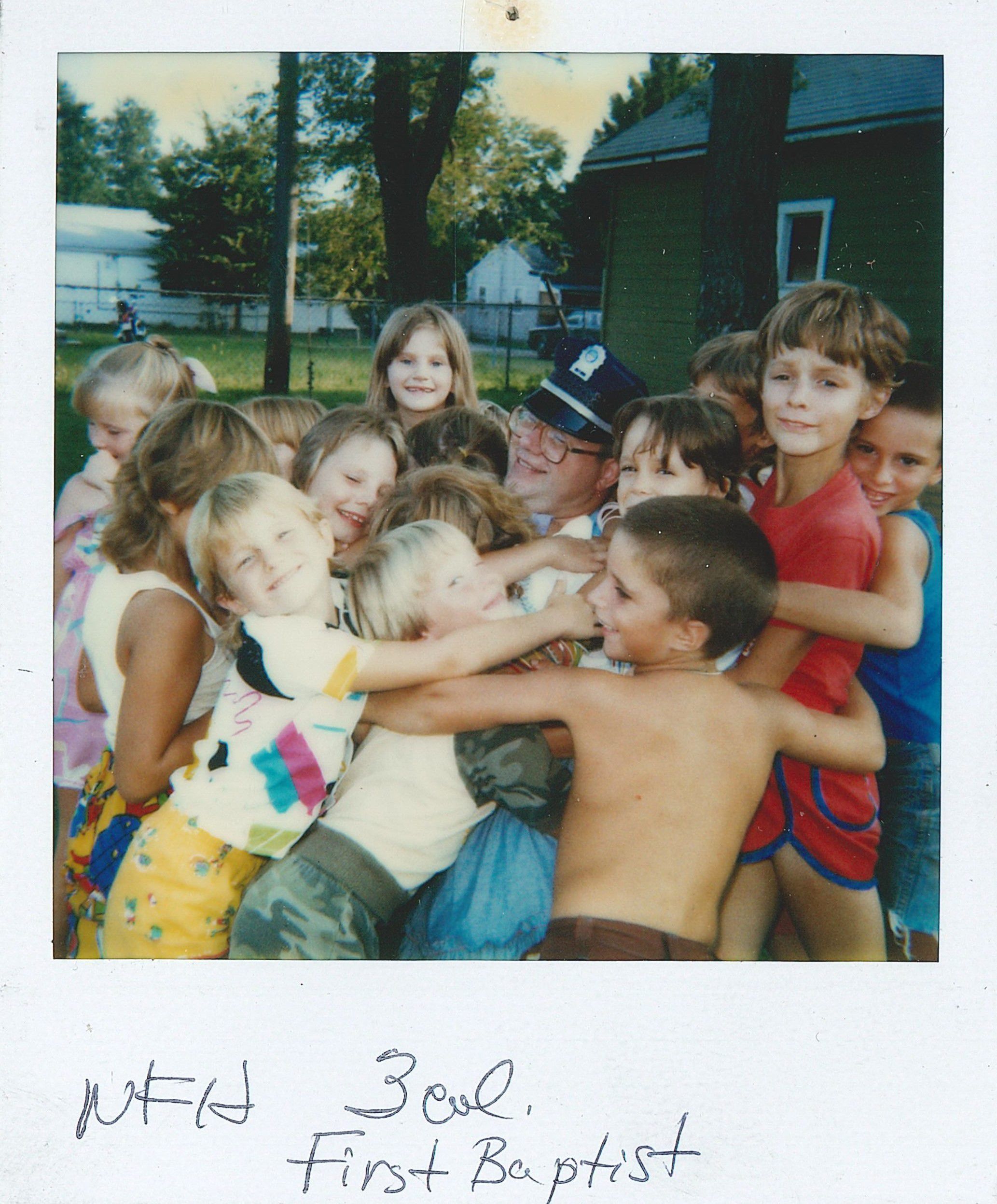 Under the direction of Pastor Steve Spurlock, the First Baptist Church had its annual Backyard Bible Club. Officer James Zimomra spoke with the kids about what his job is like and why he chose to be an officer.Photograph Details
