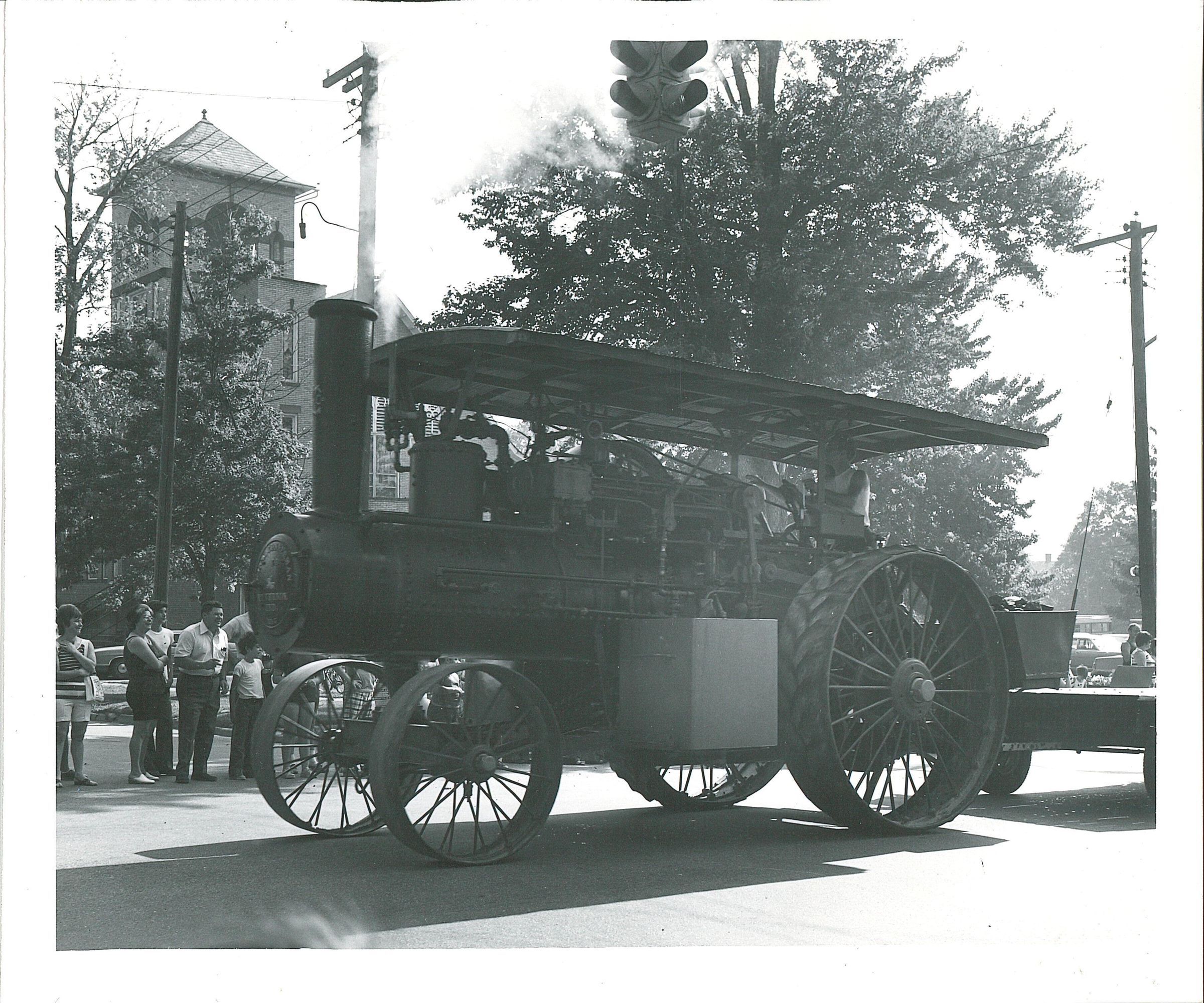 Traction engine at the intersection of East Broad Street and South Center Street. First Christian Church in the background. Part of the 1975 or 1976 Fourth of July Bicentennial parade.Collection