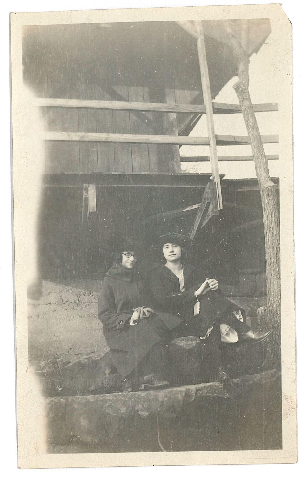 Unidentified people sitting on the rocks beneath the walkway of the East Branch Covered Bridge. Late 1920's to early 1930's.
