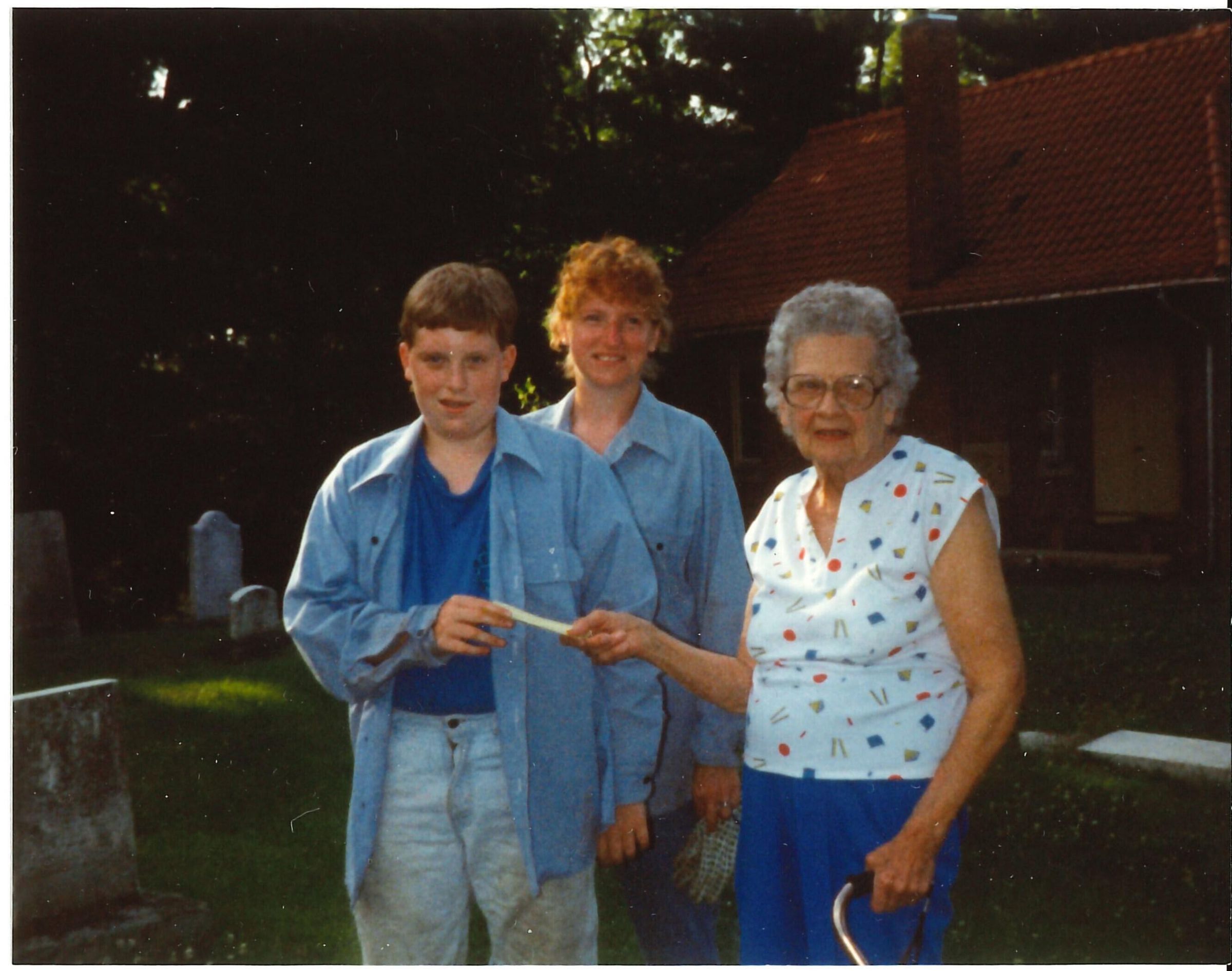 East side Cemetery and Chapel. L-R David Laughlin, Linda Laughlin and Mrs. Elva Bash, one of the members of the Cementary AssociationPhotograph Details