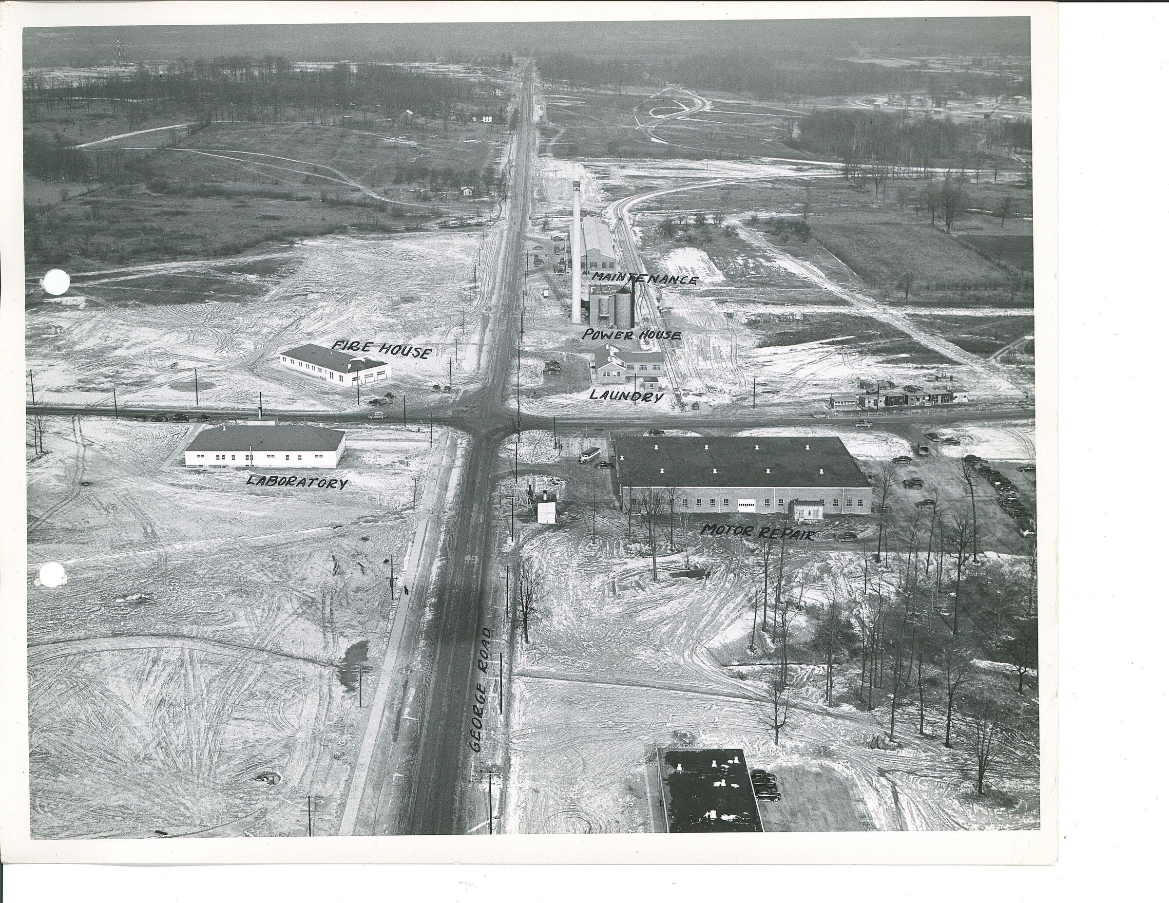 Ariel view looking North showing the completed superstructure of the Maintenance and Repair Buildings and other buildings in the area. From Class "A" Construction Photographs - Hunkin-Conkey Construction Company, Book NO. 4Photograph Details