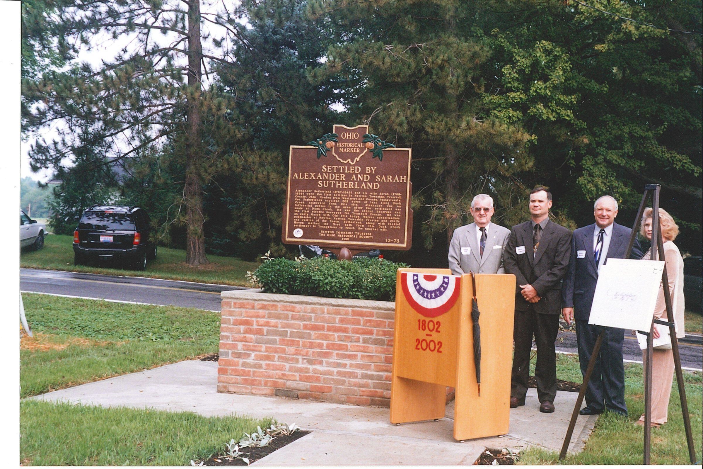 Newton Township Trustees at the bicentennial ceremony. L-R: George Prelac, Peter Augusta, Delbert J. Woloski (trustee chairman) and Kay Lingo (township clerk). The township erected a plaque at the intersection of Hallock-Young and Hallock-Sook Road in honor of its first settlers, Alexander and Sarah Sutherland.Photograph Details