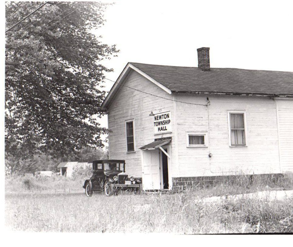 Newton Township Hall located on Newton Falls Bailey Rd. Photo taken by Robert Irwin and his son, Dean for the revised edition of the History of Newton Falls. John Cover was custodian and it is his car parked out front. Building was the old Lutheran Church which was on Newton Tomlinson Rd, purchased by the Grange and moved to Arlington Rd (Newton Falls Bailey Rd). Was used used as Grange Hall and Newton Twp Hall untill 1978 when new Twp building was built. The building was purchased by Peter Talanca and is now (2008) housed at his place of business (U-Haul and Storage Facility) on Arlington Rd.Photograph Details