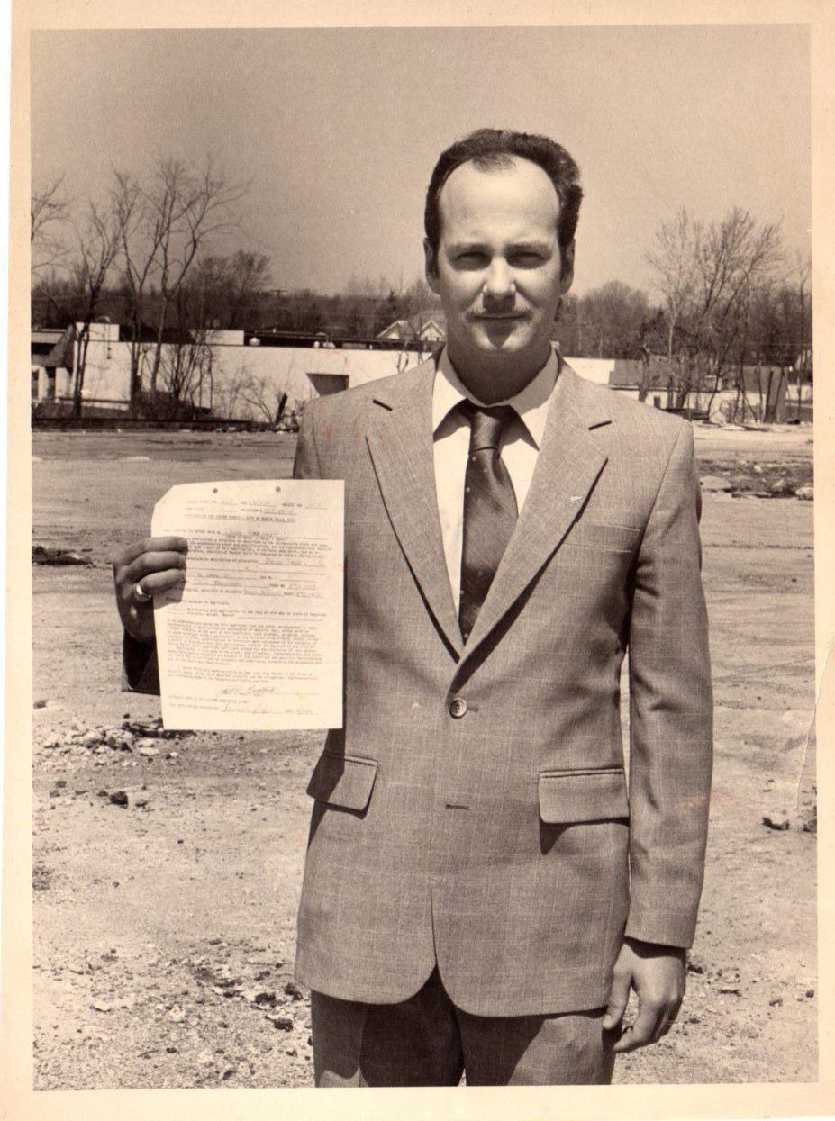 John Neidhart shows his building permit he received from the city to construct a new building for Allen's Drugtown at Broad and Canal.Photograph Details