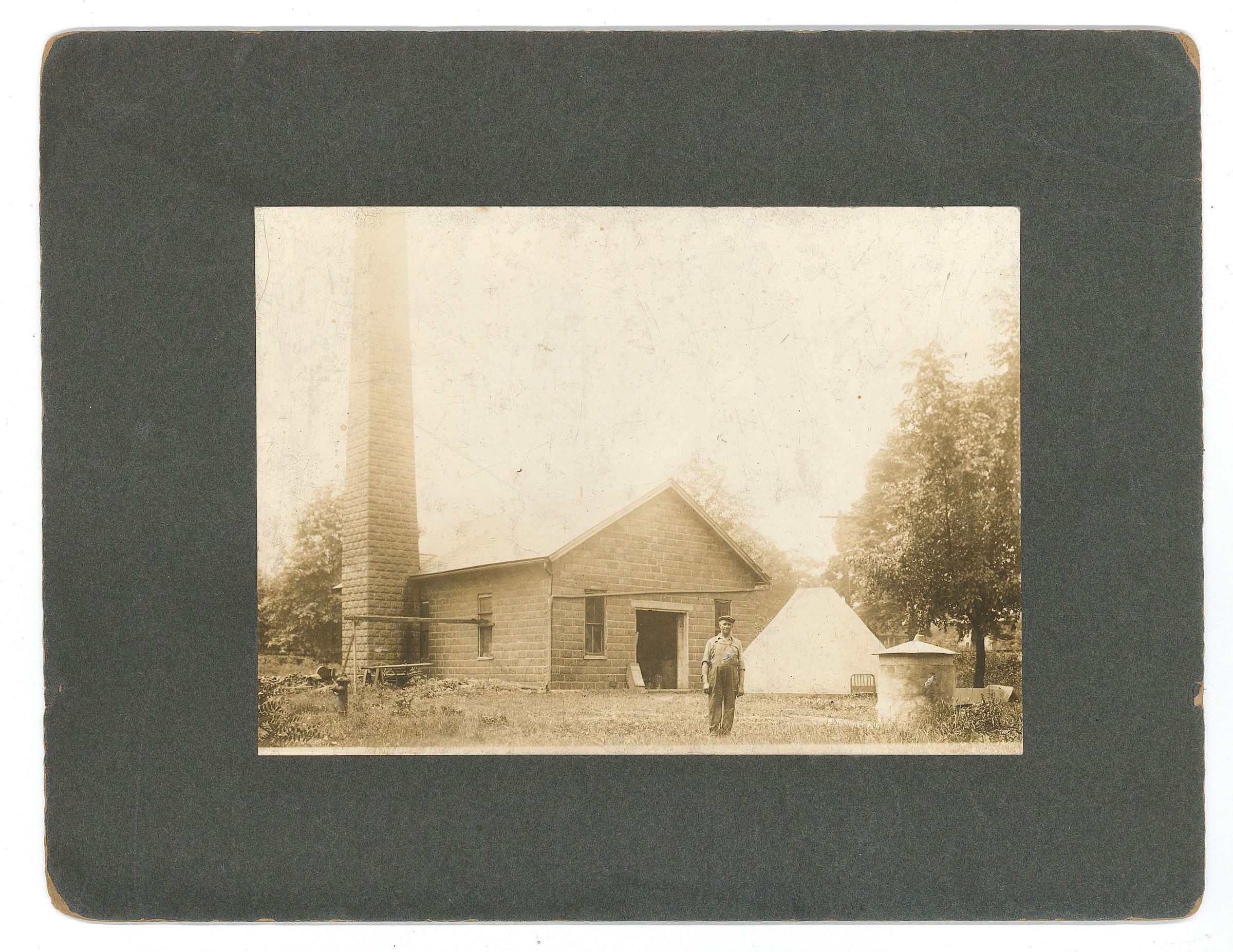 Amos Lawton standing in front of the Water Plant. He is the overseer of the plant. year 1908Photograph Details