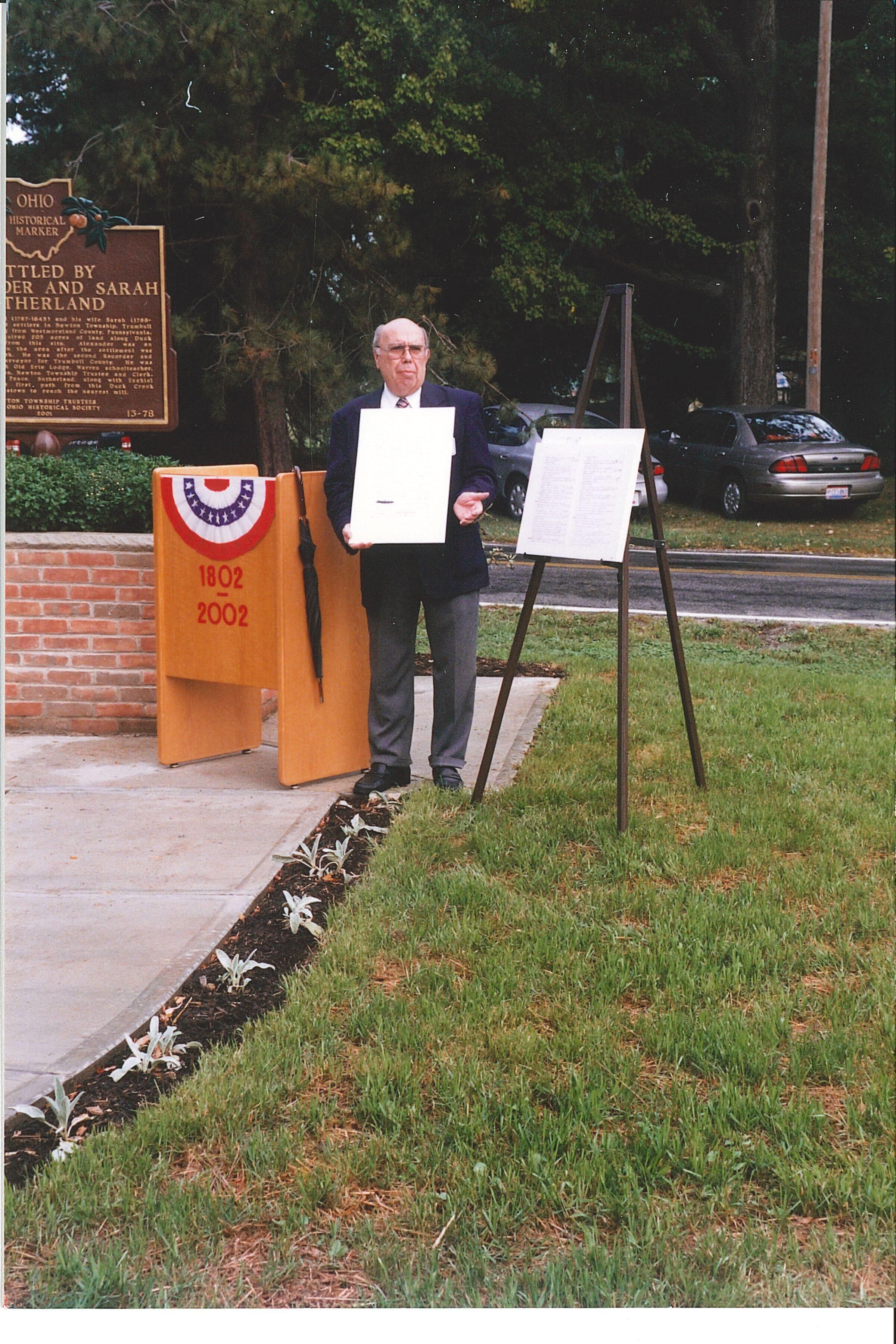 Wendell F. Lauth of the Trumbull County Historical Society provides historical data on the 1802 Duck Creek Settlement, located near the intersection of Hallock-Young and Hallock-Sook Roads. The township erected a historical marker in honor of these early settlers to celebrate its bicentennial.Photograph Details