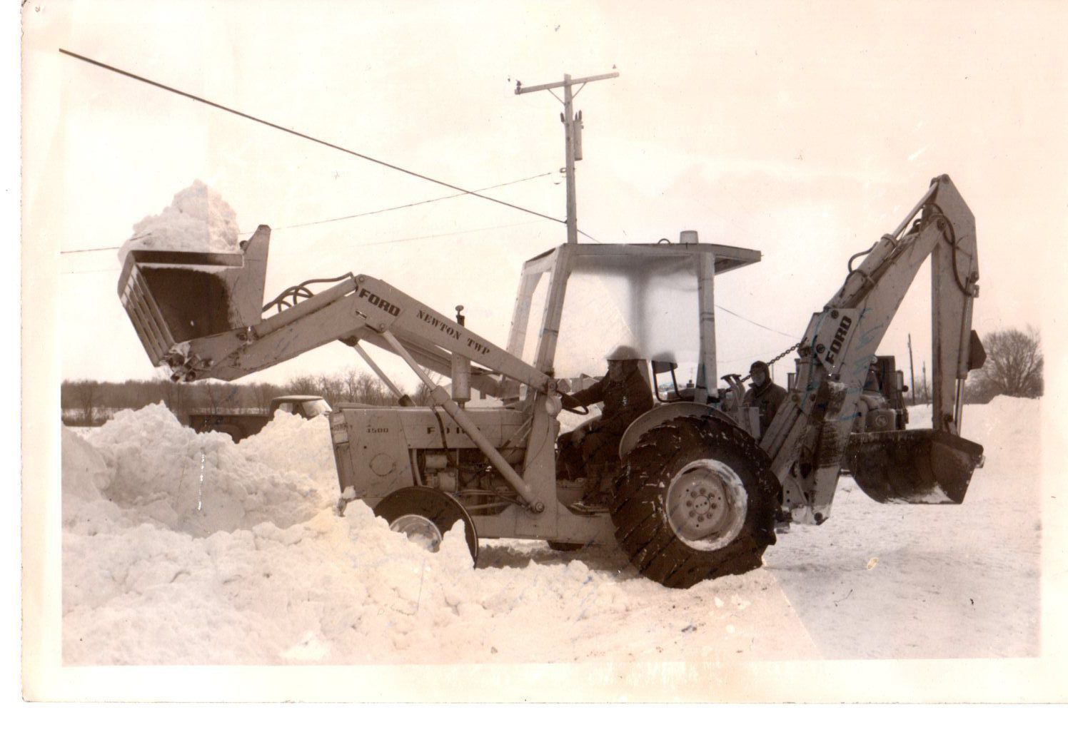 This photo shows what remains of a house under construction on Newton Tomlinson Road. The blizzard winds flattened the house which was ready to be shingled and wind driven snow just about buried the remains.Photograph Details