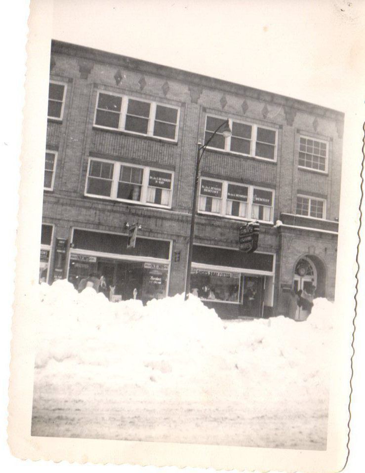 Broad Street business area covered in snow. Street is cleaned but no parking areas are open. In total there were 29 inches. Pictured is Fink's Fashion Shop and misc. businesses.Photograph Details