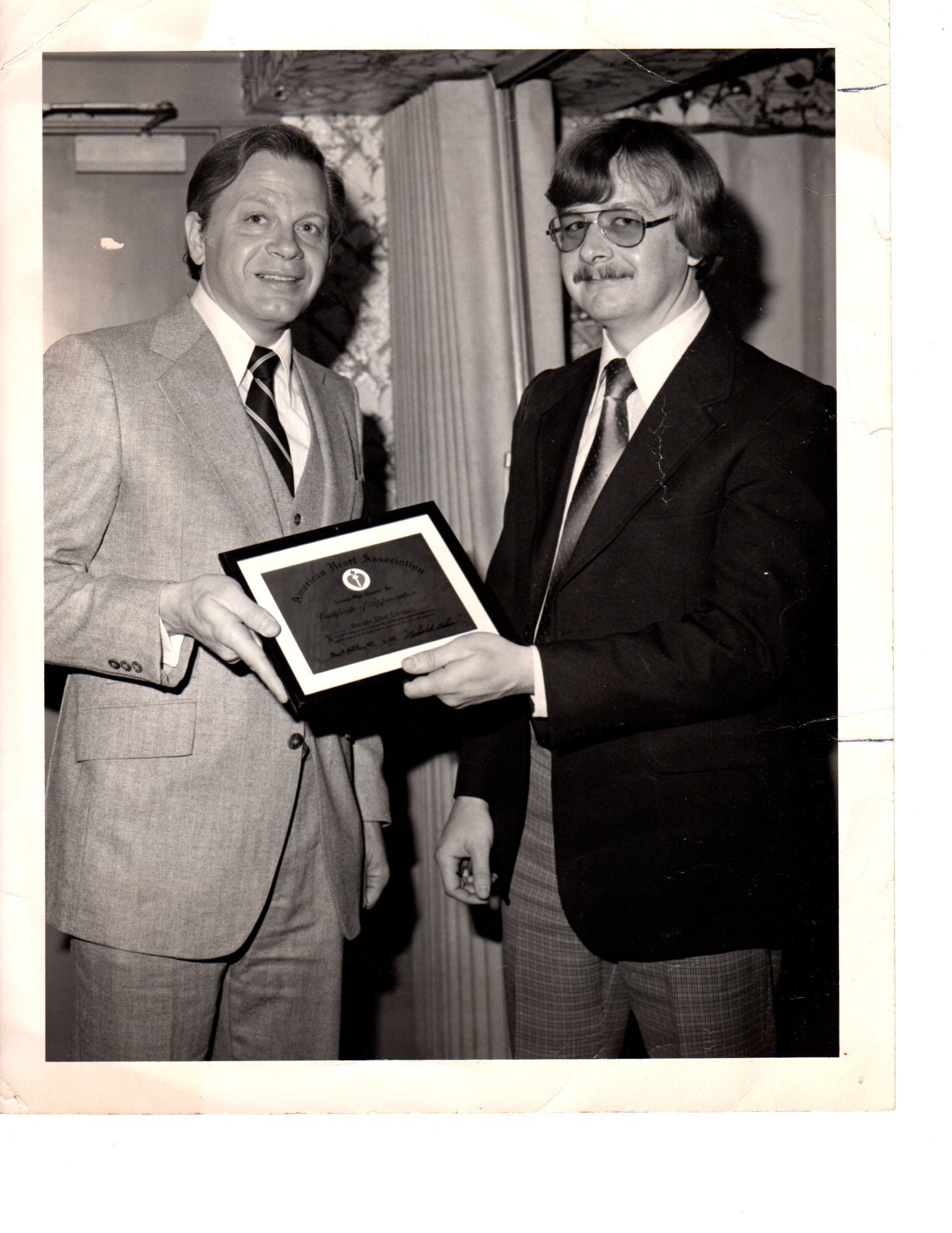 Dave Sherwood, NF right, supervisor of Food Franchise Inc, a member of the Burger Chef Co-op, receives the Heart Association's special award for public support in the fight against disease of the heart. Dr George Beelen, left chairma.Photograph Details
