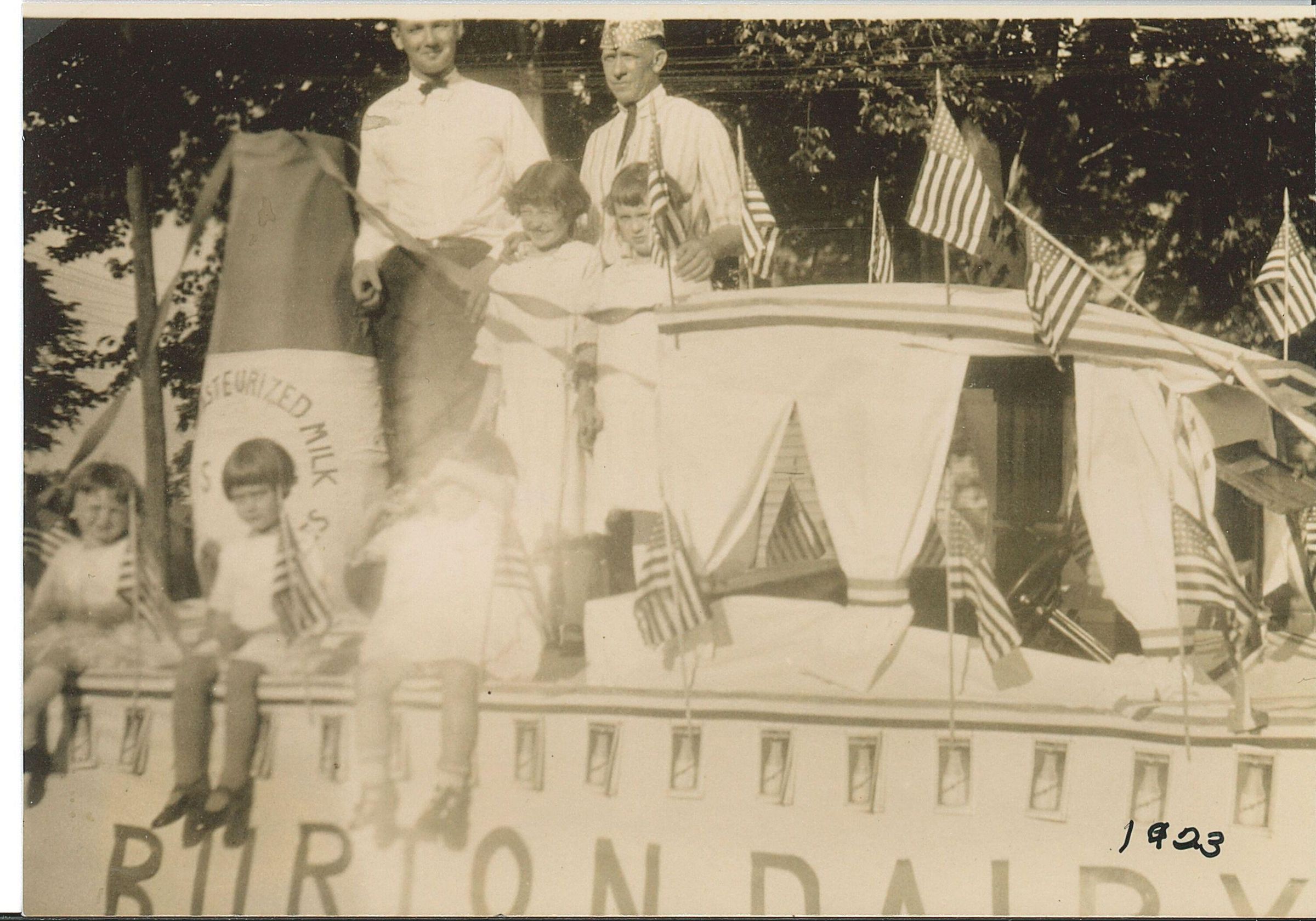 Burton's Dairy float, possibly part of a Fourth of July parade. Standing men, L-R: Louis Perry and Emmett Finnical. Children, L-R: Dorothy Finnical, Louise Lawton, Helen Burton Cummings, Audrey Finnical, and Marjorie Burton Hofus.Photograph Details