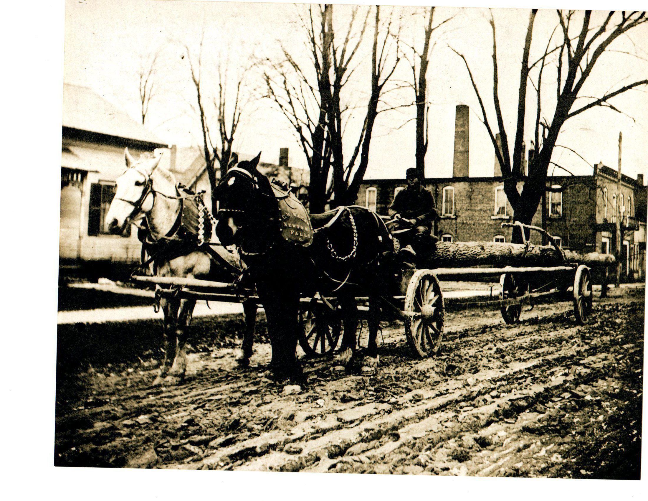 C. W. Wager, Newton Falls was a lumber hauling company in our town. Notice the muddy streets but the sidewalks are nice and neat. On. Broad Street.Photograph Details