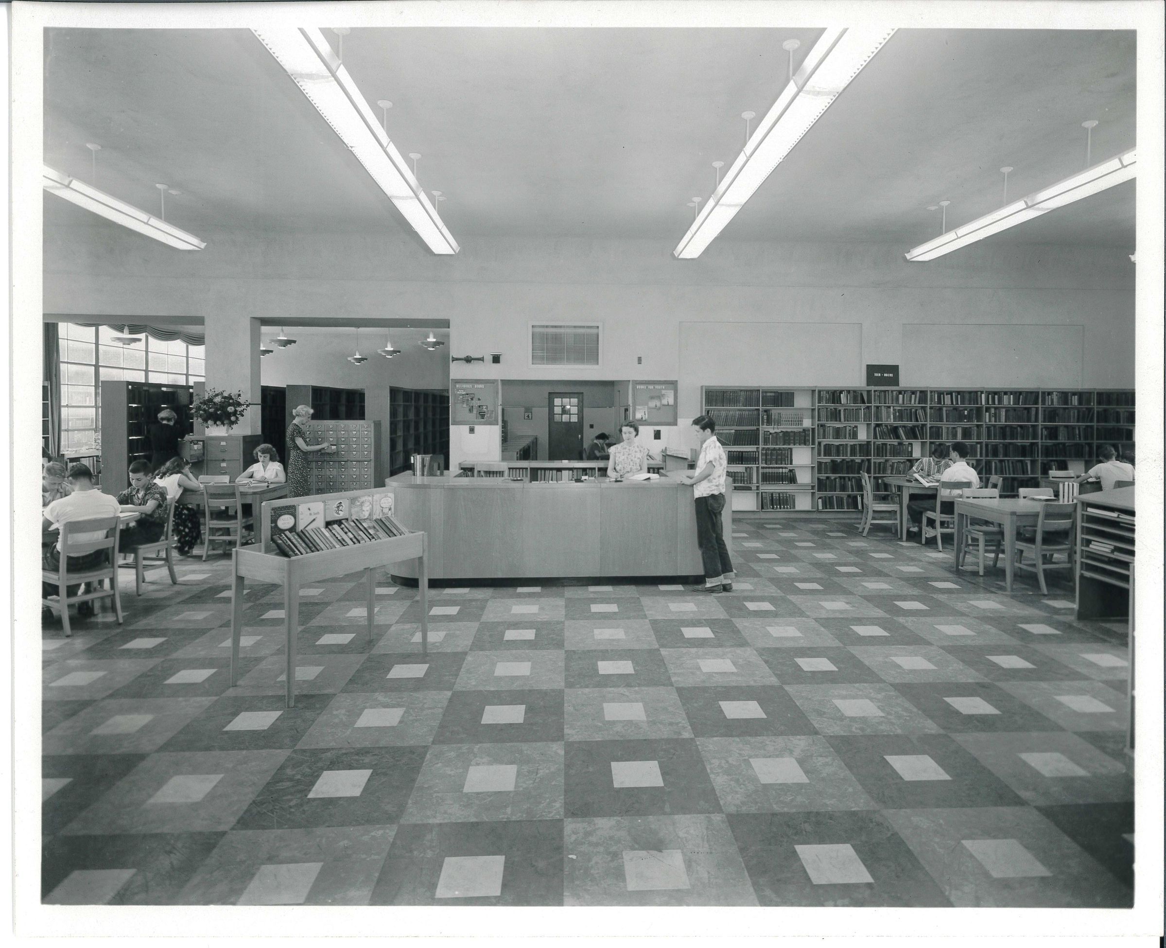 L-R Library staff, Ella Woodward at the filling cabinet, Mildred Mattes at the card catalog and Ruth Sherac at the circulation deskPhotograph Details