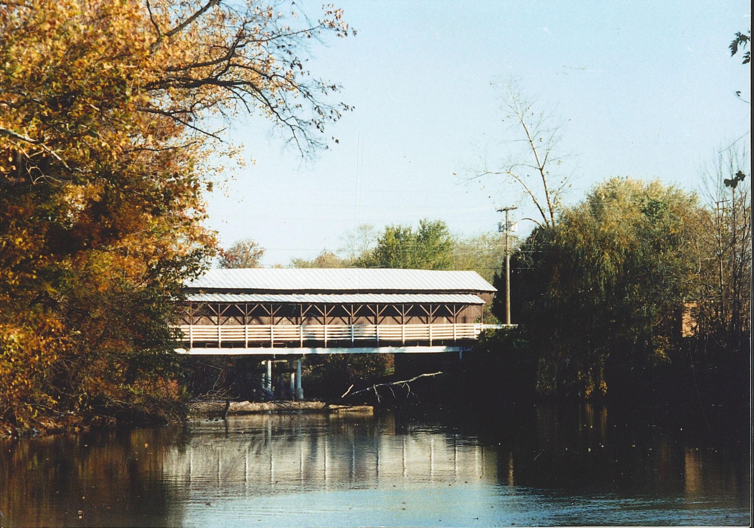 Postcard showing the covered bridge over the east branch of the Mahoning River. The bridge was built in 1831 and the walkway added in 1921. It is the second oldest covered bridge in Ohio.Category