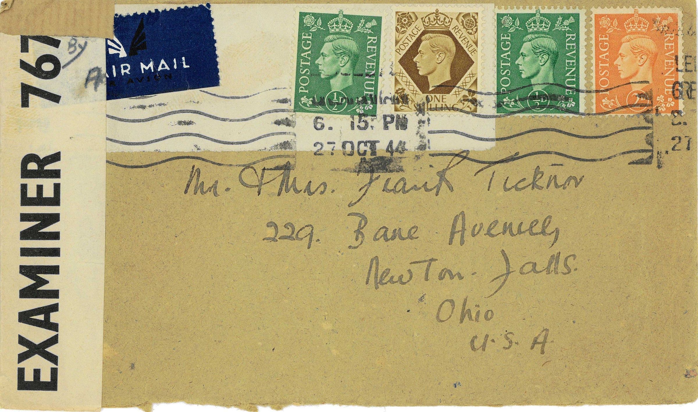 Correspondence to Mr. & Mrs. Frank Ticknor from Leicester, Great Britain (no letter inside).Subject Person/Organization
