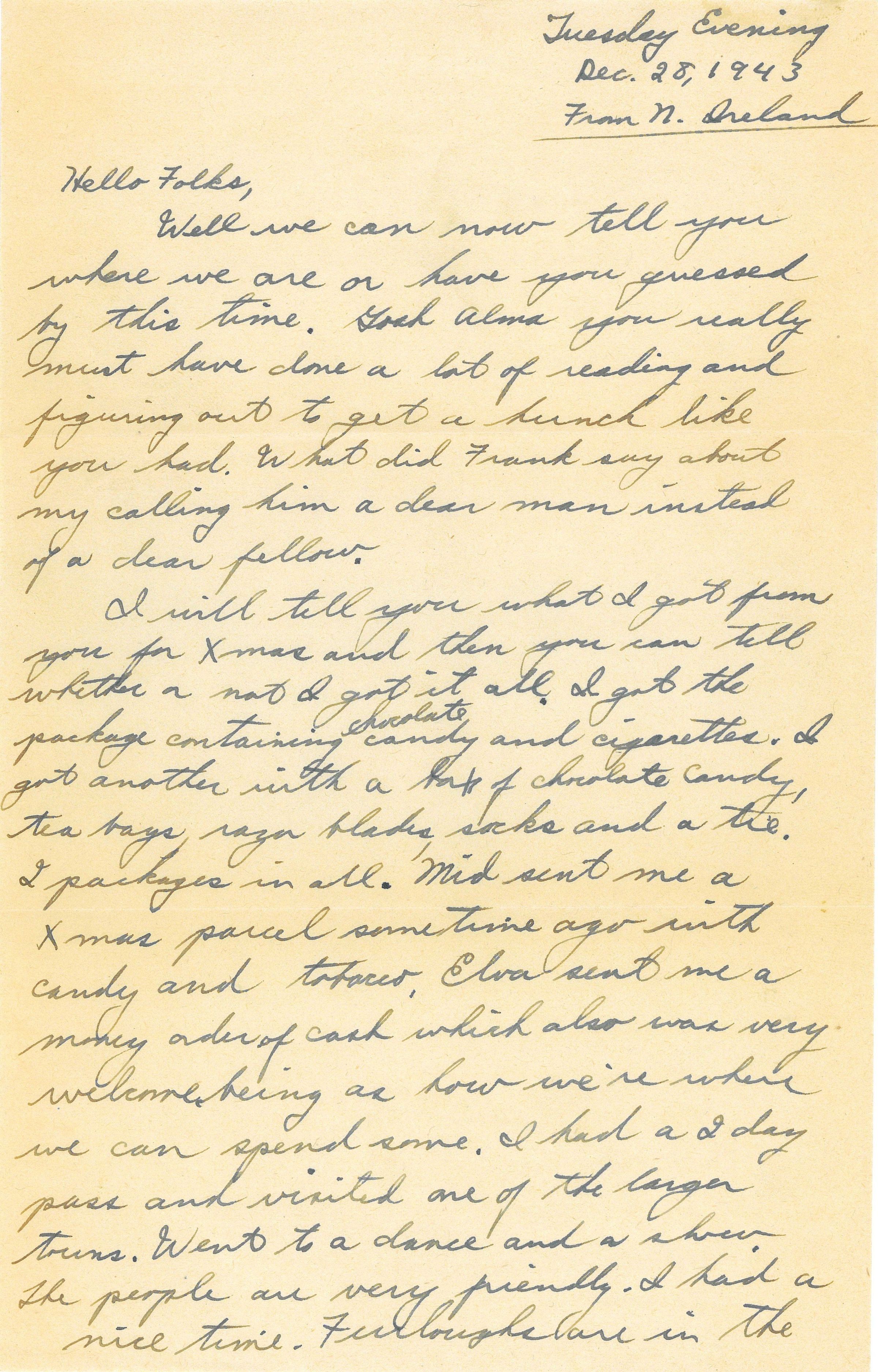 I will tell you what I got from you for Xmas and then you can tell whether or not I got it all. I got the package containing chocolate candy and cigarettes. I got another with a lot of chocolate candy, tea bags, razer blades, socks and a tie. 2 packages in all. Mid sent me a Xmas parcel sometime ago with candy and tobacco. Elva sent me a money order of cash which also was very welcome being as how we're where we can spend some. I had a 2 day pass and visited one of the larger towns. Went to a dance and a show. The people are very friendly. I had a nice time. Furloughs are in the rage again. I'm not so crazy about seeing London. I figure it would be too much hustle and bustle there. I believe if I got a furlough I'll spend in in Belfast or Londonderry.