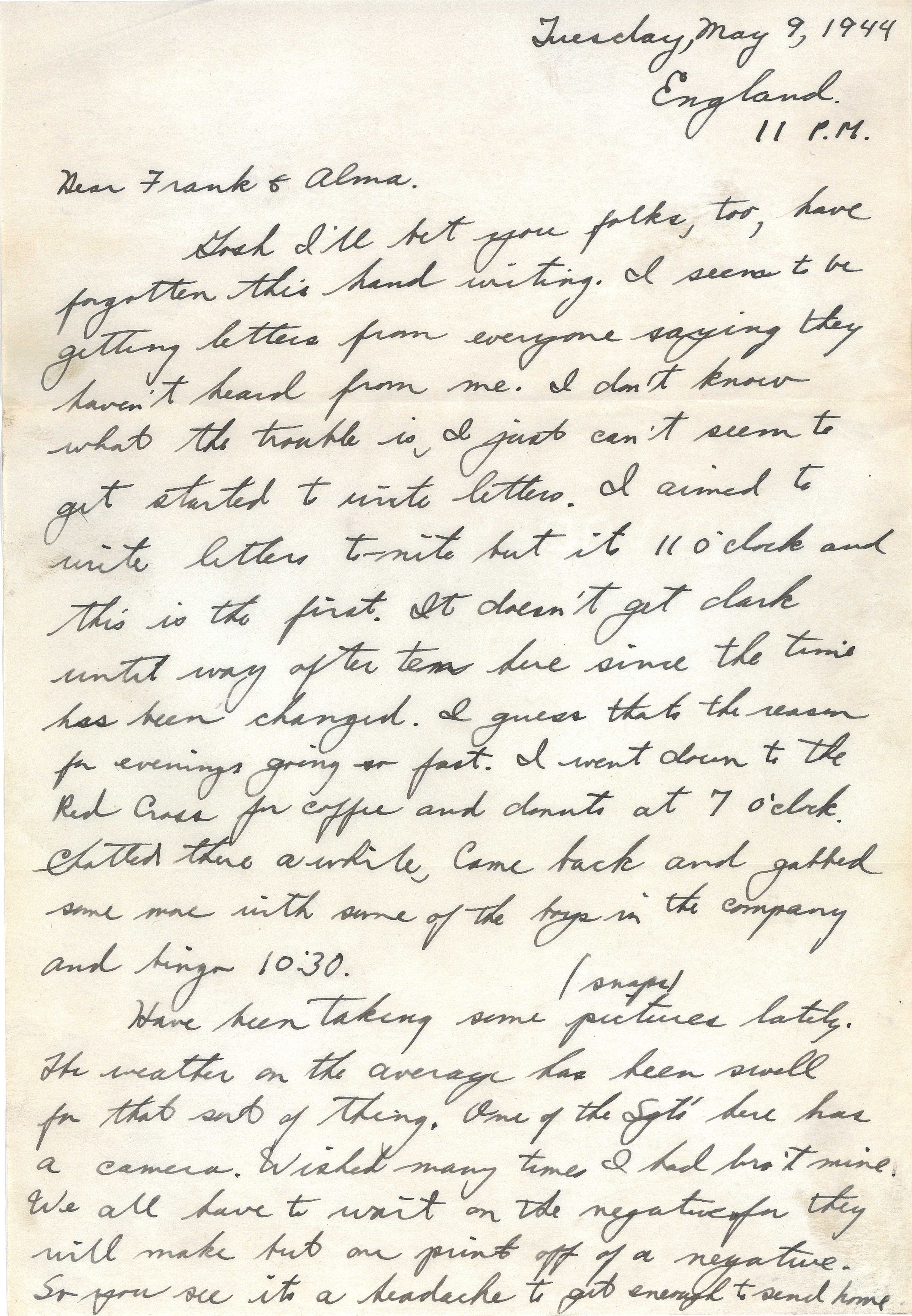 Gosh I'll bet you folks, too, have forgotten this hand writing. I seem to be getting letters from everyone saying they haven't heard from me. I don't know what the trouble is, I just can't seem to get started to write letters. I aimed to write letters t-nite but its 11 o'clock and this is the first. It doesn't get dark until way after ten here since the time has been changed. I guess thats the reason for evenings going so fast. I went down to the Red Cross for coffee and donuts at 7 o'clock. Chatted there a while, came back and gabbed some more with some of the boys in the company and bingo 10:30.