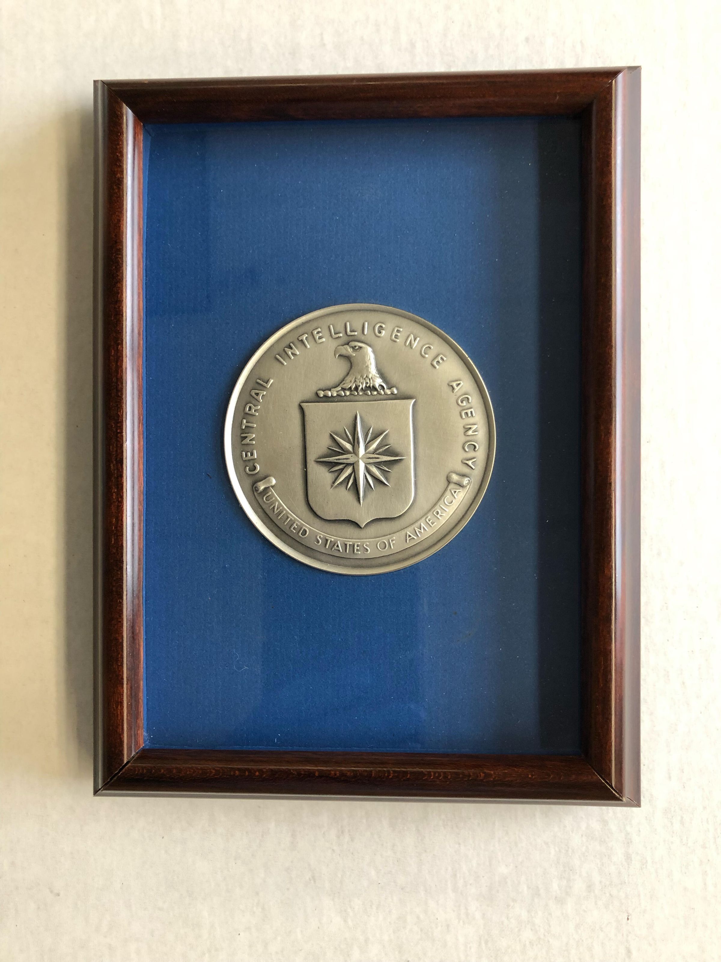 Framed CIA retirement medallion belonging to Donald L. Martin. The silver retirement medallion is awarded for a career lasting 25-34 years.Collection