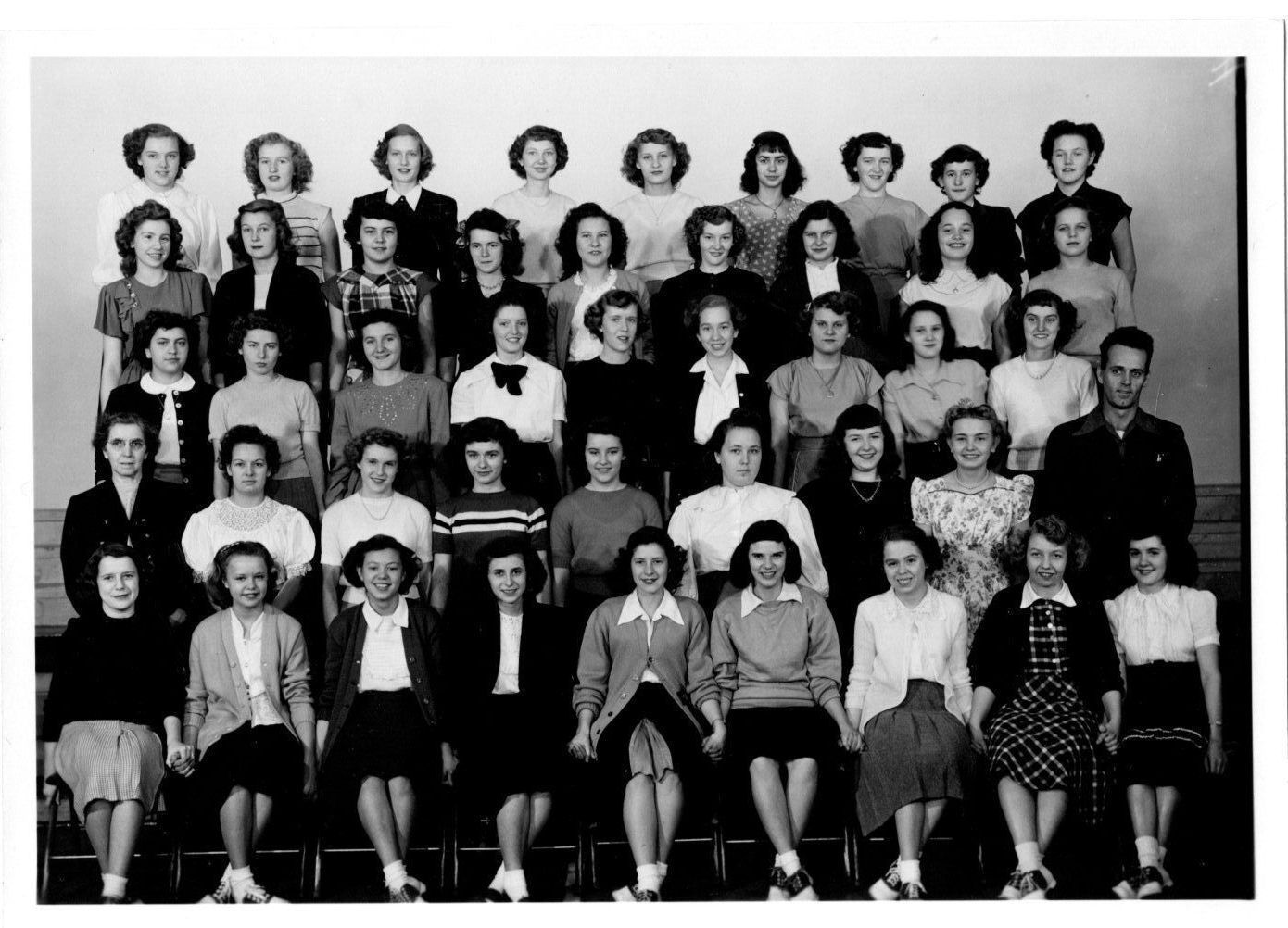 Jr Girls Class Photo, Class of 1951, taken 1948-1949. Left to right. Row 1: Holbrook, Clara Surick, Anna Stimac, Betty Ann Soos, Williams, Marjorie Geist, Ruth Hawkins, Alice Teutsch. Row 2: Ann Lewis, Irene Tyron, Jeanne Allen, Nancy Ingraham, Carol Sue Grissom, Thelma Ackerman, Donna Genhart, Margaret Rink, Mr. Charles. Row 3: Macklin, Mary Lou Daley, Ann Bednarcik, Booher, Patricia Kress, Patricia McIntosh, Nancy Comstock, Margaret Clark, Margaret Dickey. Row 4: Vera Hayes, Marie Matas, Wilma Gordon, Fay Adams, Gertrude Figley, Grossart, Mary Reid, Marlene Rogos, Janet Stanley. Row 5: Edith Johnston, Beverly Morgan, Marilyn Cain, Eileen Kilroy, Eleanor Horvath, Betty Ann Etto, Virginia McCabe, Mildred Bartek, B. Adams.Photograph Details