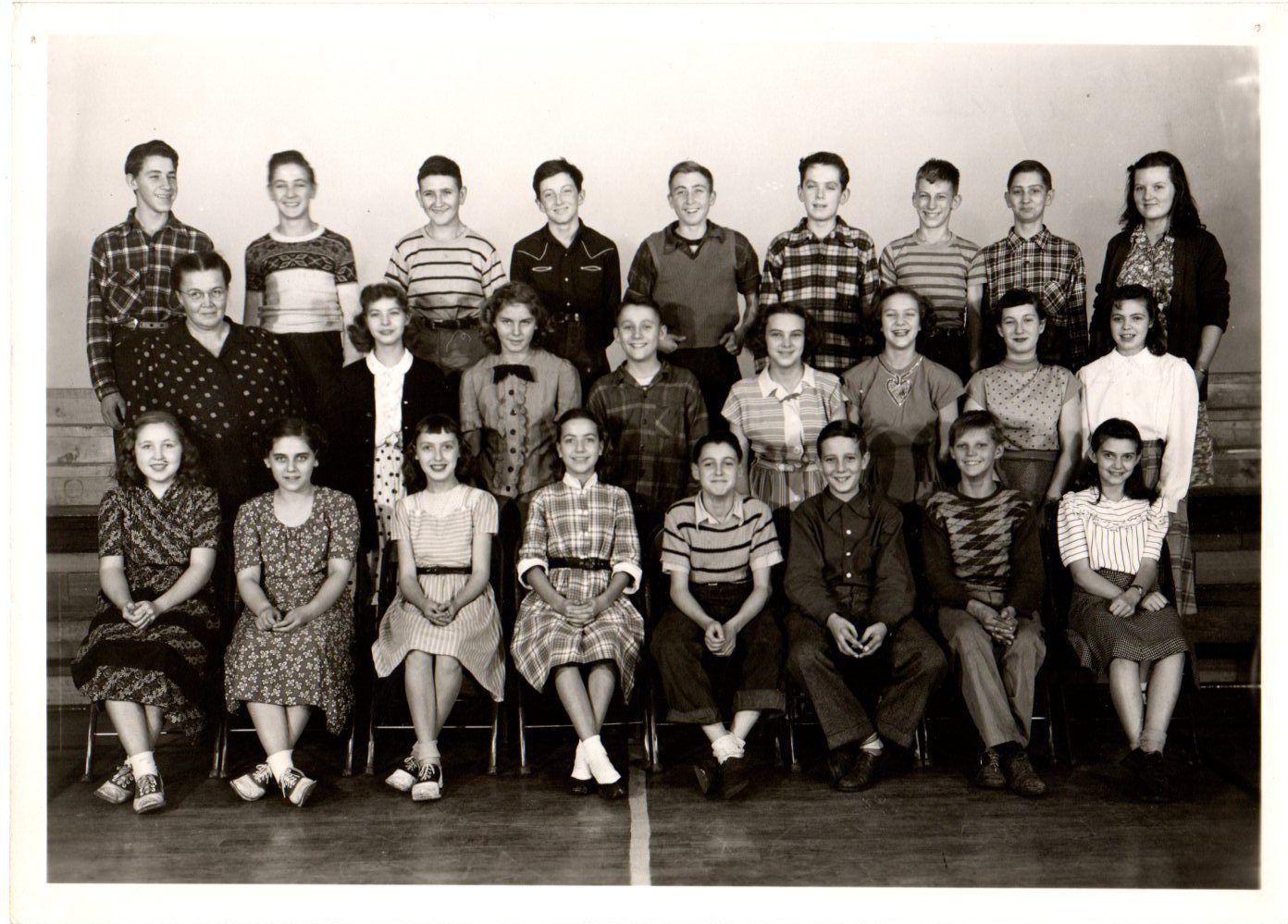 Eighth Grade Miss Adams' class, 1948-1949. Bottom Row Left to Right: Georgene Hammond, Ruth Ann Ingraham, Mary Martha Holden, Hale, Green, Robert Greitzer, John Meleski, Patricia Lura Geist. 2nd Row: Leah Adams, Needler, Katherine Herron, Ronald Evans, Johnston, Faye Garland, Imlay, Bonnie Lou Hawkins. Top Row: Haines, Maas, Hall, Ronald M. Gilronan, Miller, MacNaughton, James McKinstry, Lane, Donna Lee Langley.Photograph Details