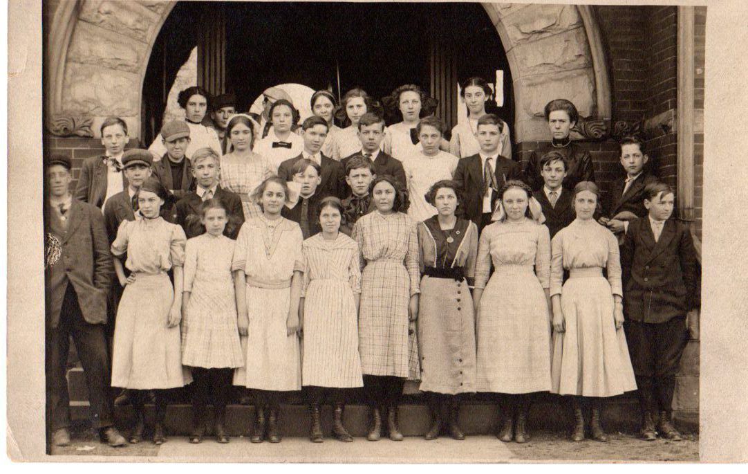 Newton Falls High School, graduating class of 1917, in their grade year. School on corner of North Center St and Jay St. Bess Harnar top row on right. Teacher is Alice Butts.Photograph Details