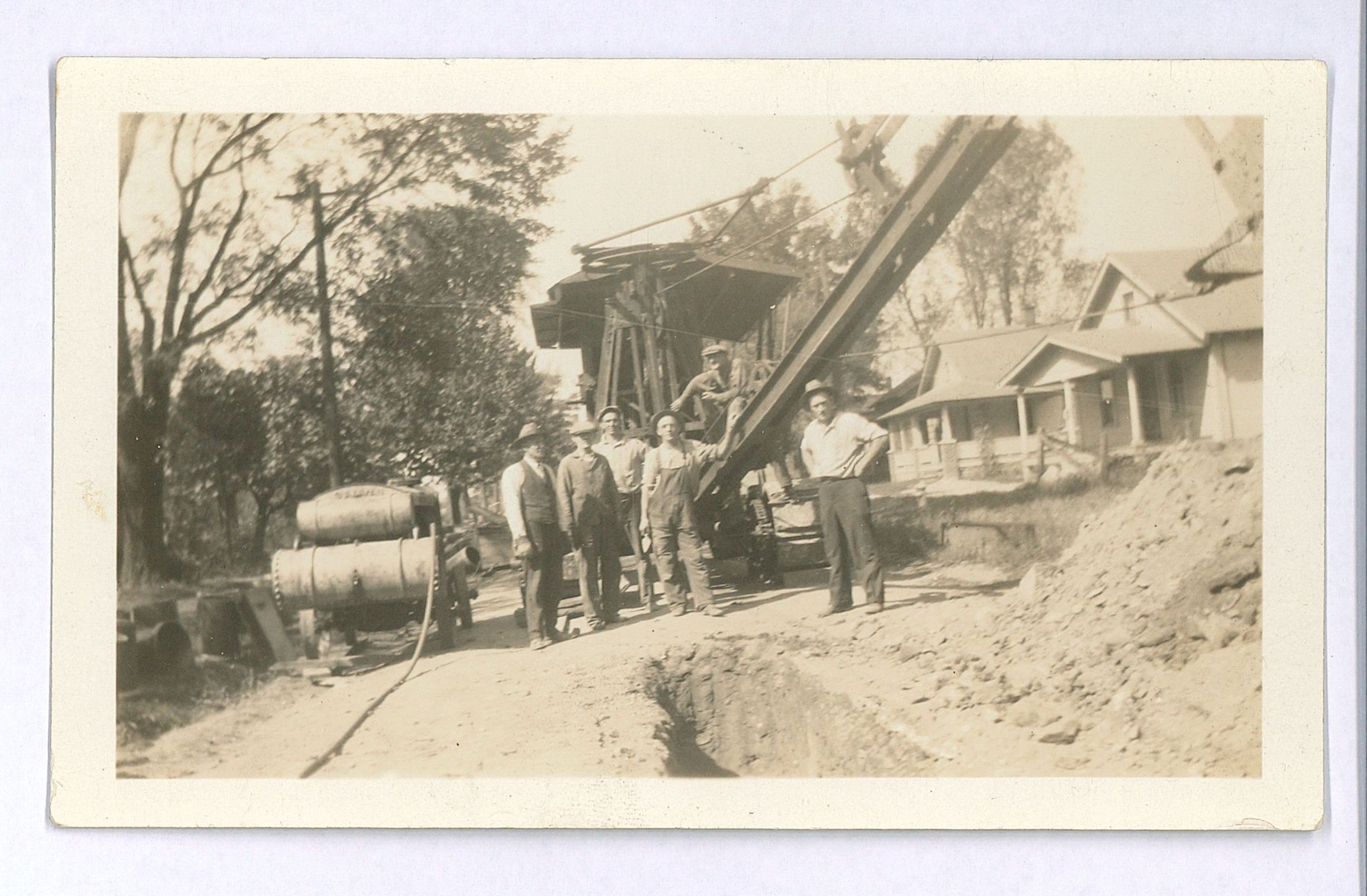 Sewer construction on Windham Rd. Pictured: Frank M. Jones, first person standing; Pete Purbaugh, third person standing; and Clyde B. Jones, seated on shovel. Other workers unknown.Photograph Details
