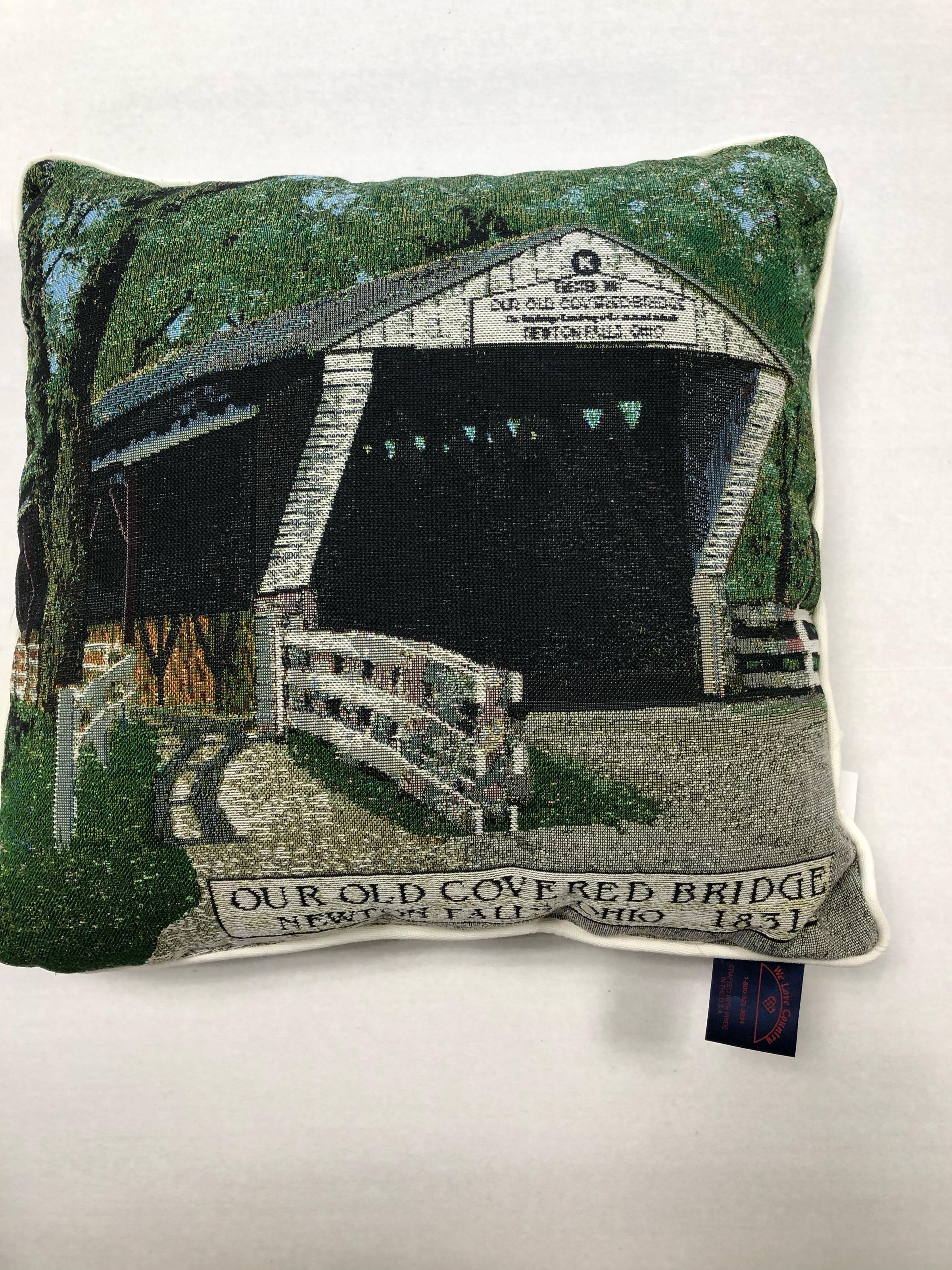 Decorative pillow showing the covered bridge over the east branch of the Mahoning River. The pillow was sold by the Newton Falls United Methodist Church. The pillow text reads: Our Old Covered Bridge Newton Falls, Ohio 1831.Inscription/Signature/Marks