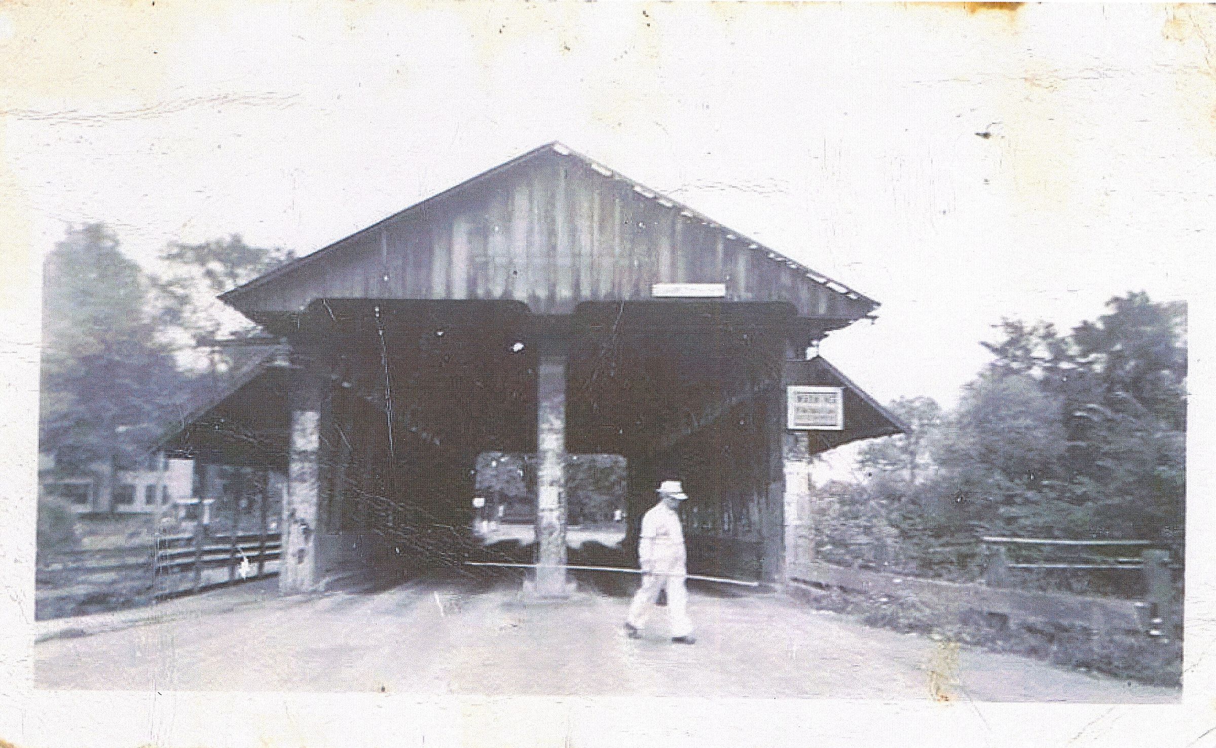 Unidentified figure dressed in white walking in front of the double covered bridge. The bridge over the west branch of the Mahoning River. The bridge was built in 1856 and demolished in 1942.Photograph Details