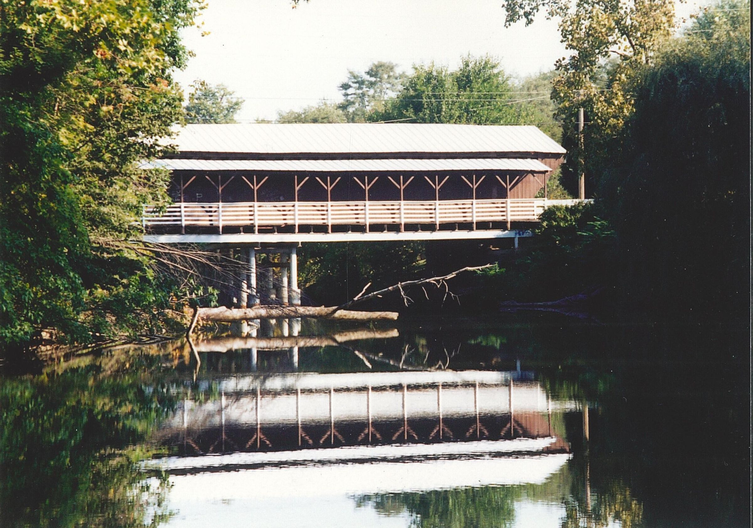 Photo of the covered bridge over the east branch of the Mahoning River and its reflection in the water. The bridge was built in 1831 and the walkway (pictured) was added in 1921. It is the second oldest covered bridge in Ohio.Category
