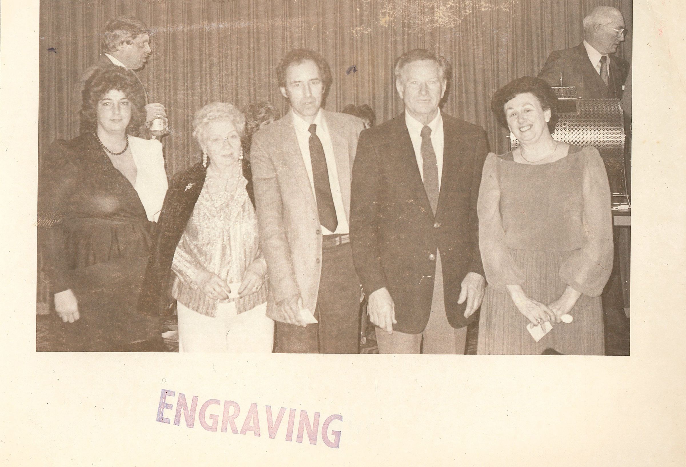 Prize winners from L-R: Lisa Finben, Fran Coynes, Roland Garland, Jerry Lenarcic and Dorothy Lamb split their grand prize winnings of the Chamber of Commerce 200 Club fundraiser held November 17, 1984.Photograph Details